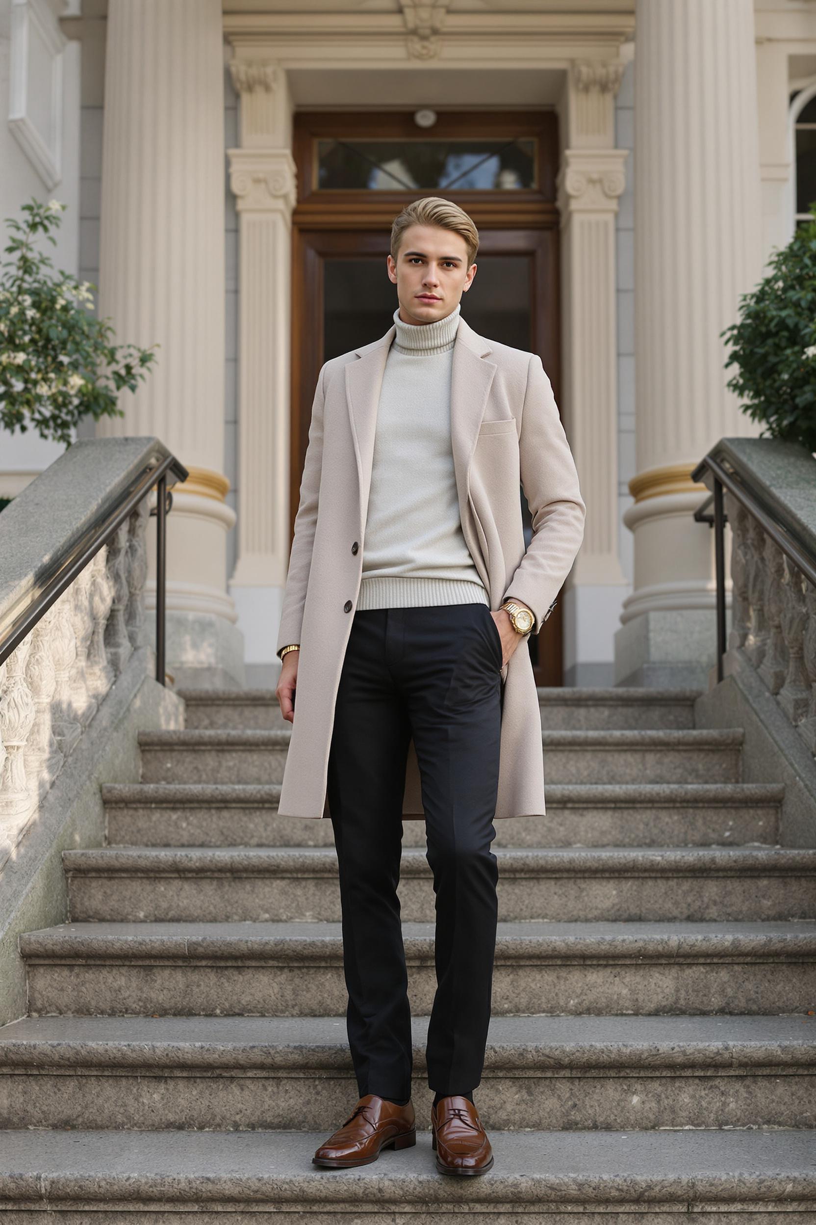 Молодой мужчина с тёмно-русыми волосами, аккуратно уложенными назад, стоит на ступенях особняка в серо-бежевом кашемировом пальто поверх светлого трикотажного свитера и классических чёрных брюк. На ногах броги, на руке золотые часы. Он смотрит прямо в камеру, поза расслабленная. Вид от колен до головы. Щадящий тёплый свет подчёркивает черты его лица.