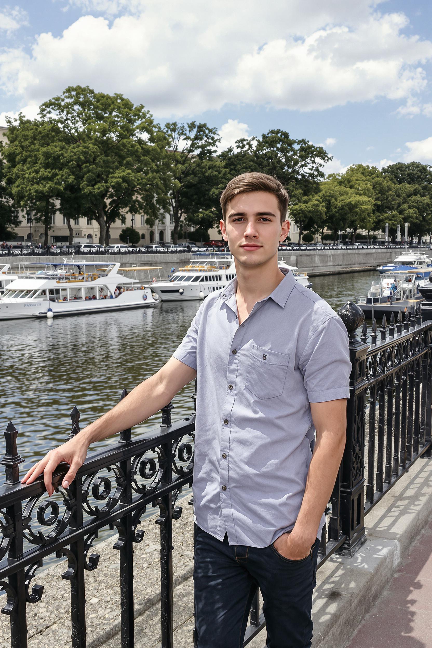 Молодой мужчина стоит у кованых перил набережной, одной рукой держится за ограждение, прямо и уверенно смотрит в камеру. На фоне — спокойная река с отражающимися облаками, белые прогулочные катера и зеленые деревья по берегам, дневной свет, средний план.