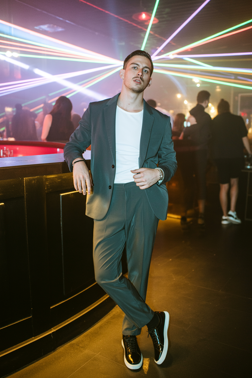Молодой мужчина в клубе, одет в темно-серый костюм с узким воротом, белую футболку и черные кожаные кеды, стоит у подсвеченной винной стойки, слегка повернувшись к камере и смотрит прямо, руки лежат в карманах пиджака. Позади него разноцветные световые лучи, атмосфера стиля и свободы.