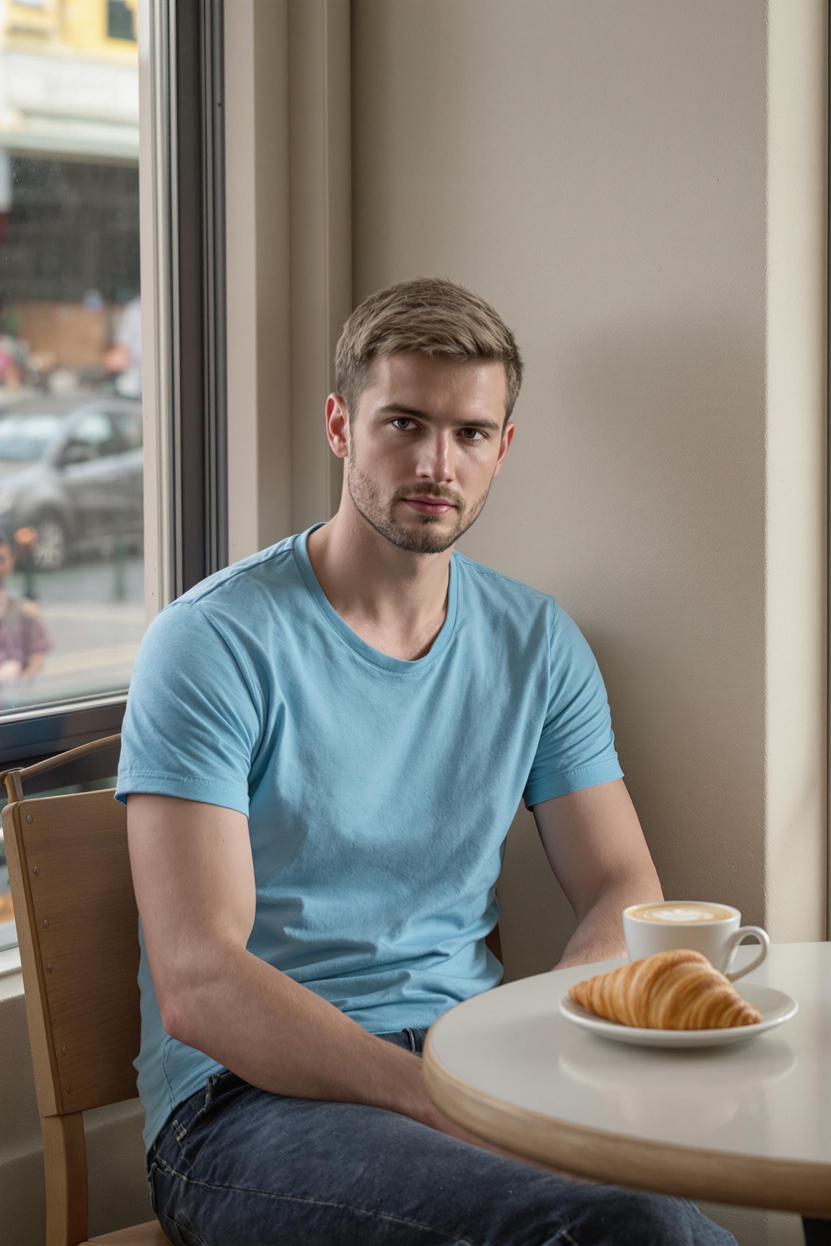 Молодой мужчина в небесно-голубой футболке и темно-синих джинсах сидит за круглым столиком у окна уютной кофейни, на столе перед ним чашка латте и свежий круассан. Он уверенно смотрит в камеру, лицо сосредоточено, вокруг мягкий рассеянный свет, средний план.