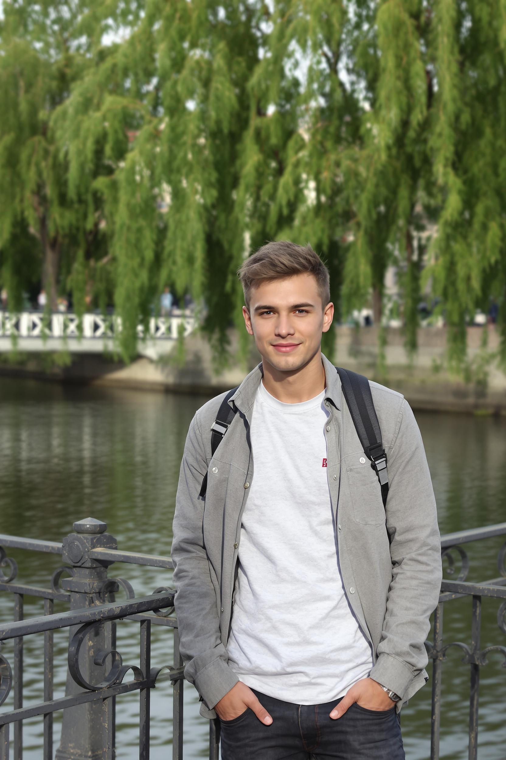 Примерить образ на себеМолодой мужчина в повседневной одежде стоит у перил городской набережной, уверенно смотрит в камеру с легкой полуулыбкой. На заднем плане — гладкая река, отражения тополей и городской мост, мягкий естественный свет, средний план.