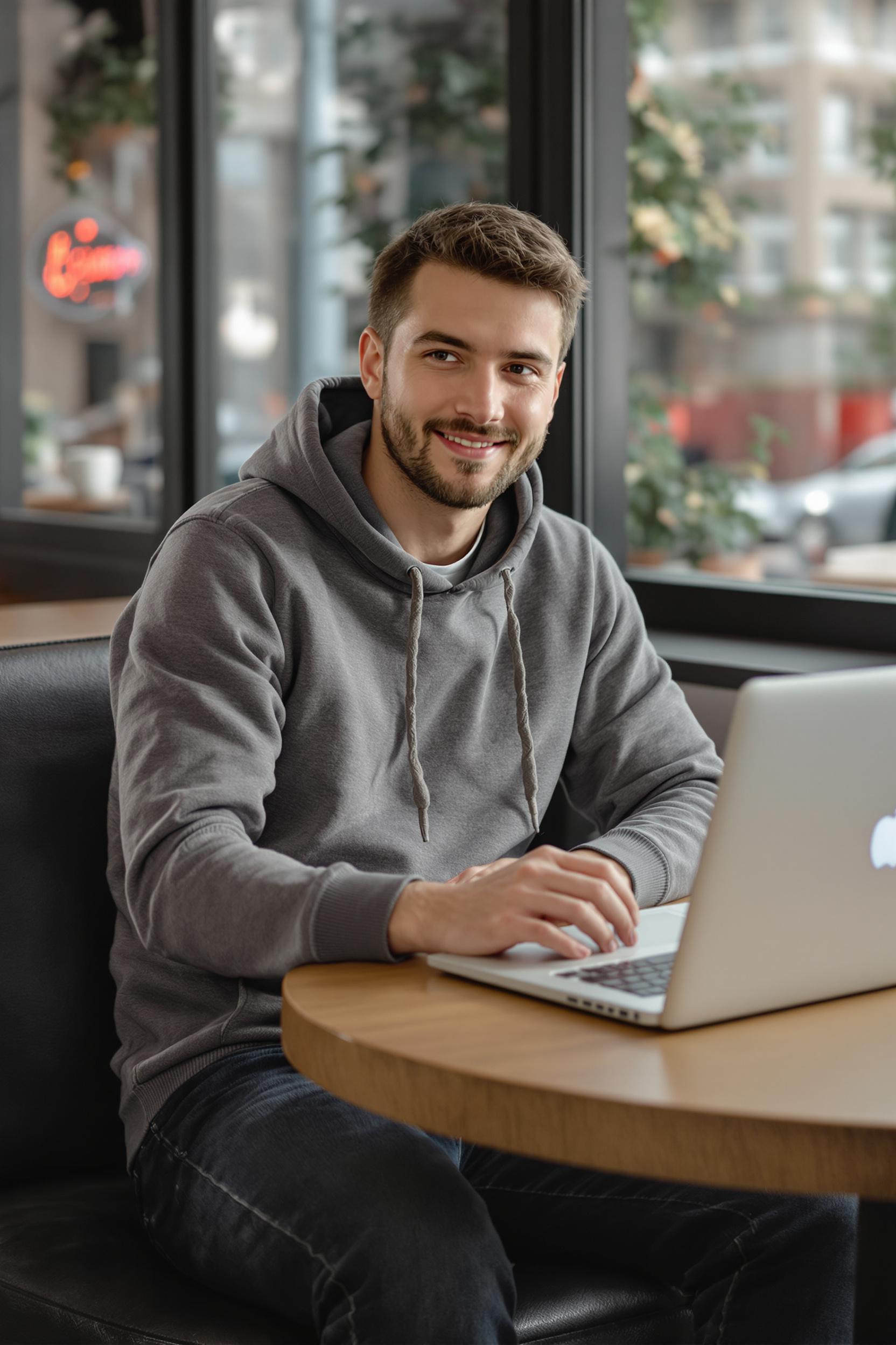 Молодой мужчина в повседневной серой толстовке и тёмных джинсах сидит за деревянным столиком в уютной кофейне. Перед ним открыт ноутбук и чашка кофе, он смотрит прямо в камеру с лёгкой улыбкой, мягкий дневной свет, средний план.