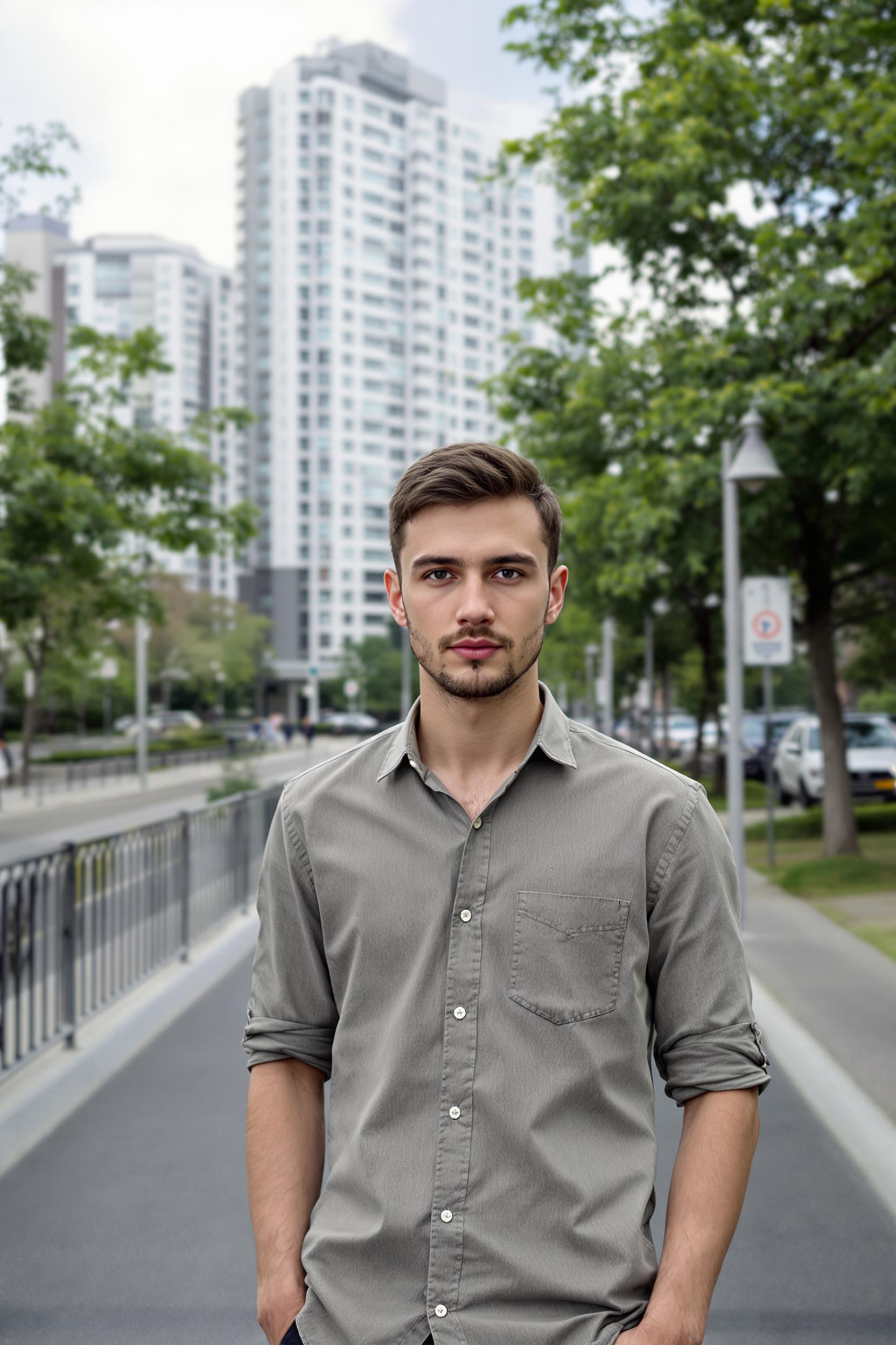Молодой мужчина в рубашке стоит на велосипедной дорожке в центре города, смотрит прямо в камеру, за его спиной видны высотные дома и городские деревья, атмосфера современного урбанизма, средний план.