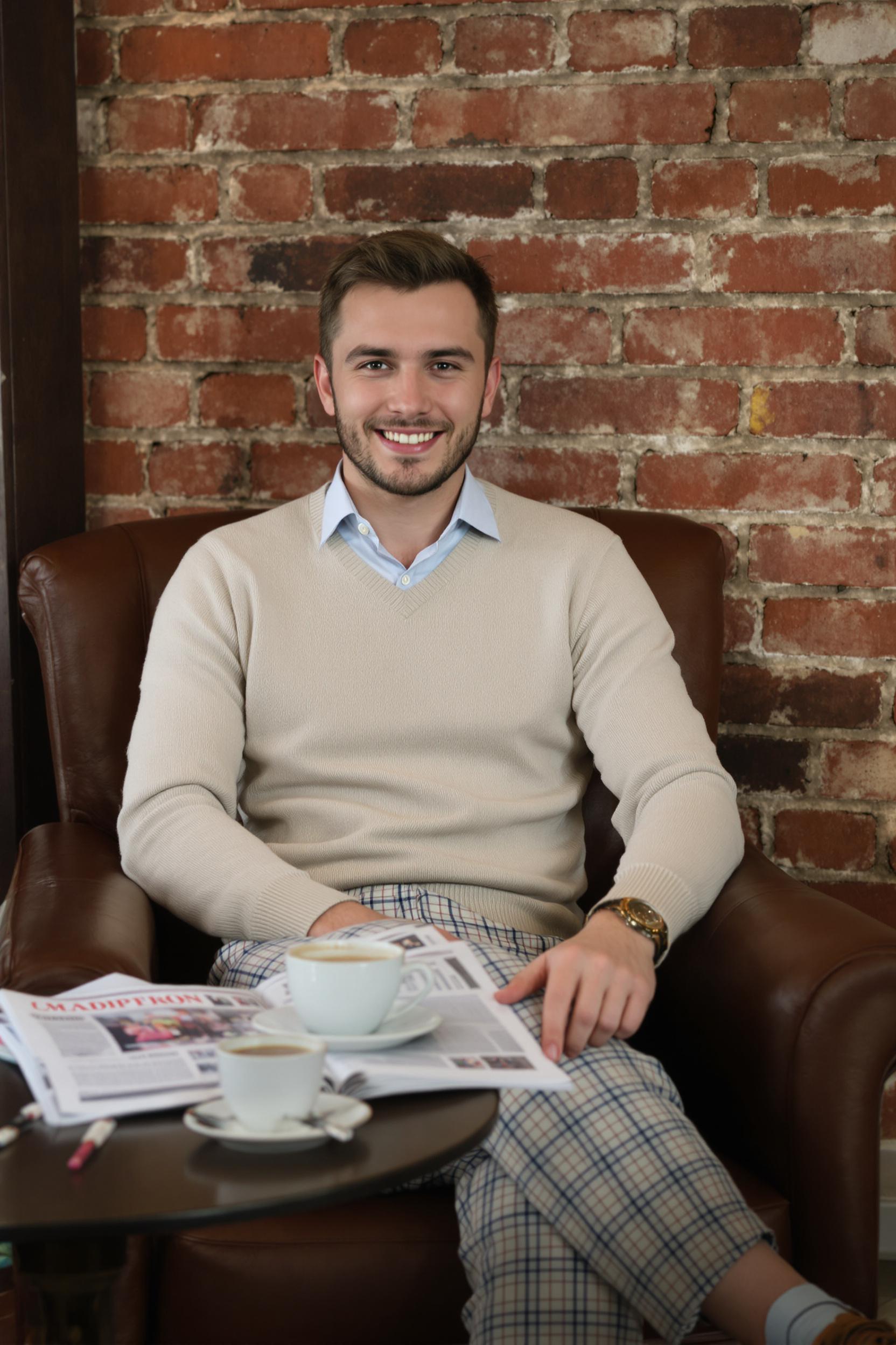 Молодой мужчина в светло-бежевом свитере и клетчатых брюках сидит на удобном кожаном кресле у кирпичной стены кофейни. Перед ним на столике чашка фильтр-кофе и раскрытая газета, он смотрит прямо в камеру с уверенной улыбкой, спокойная атмосфера, средний план.