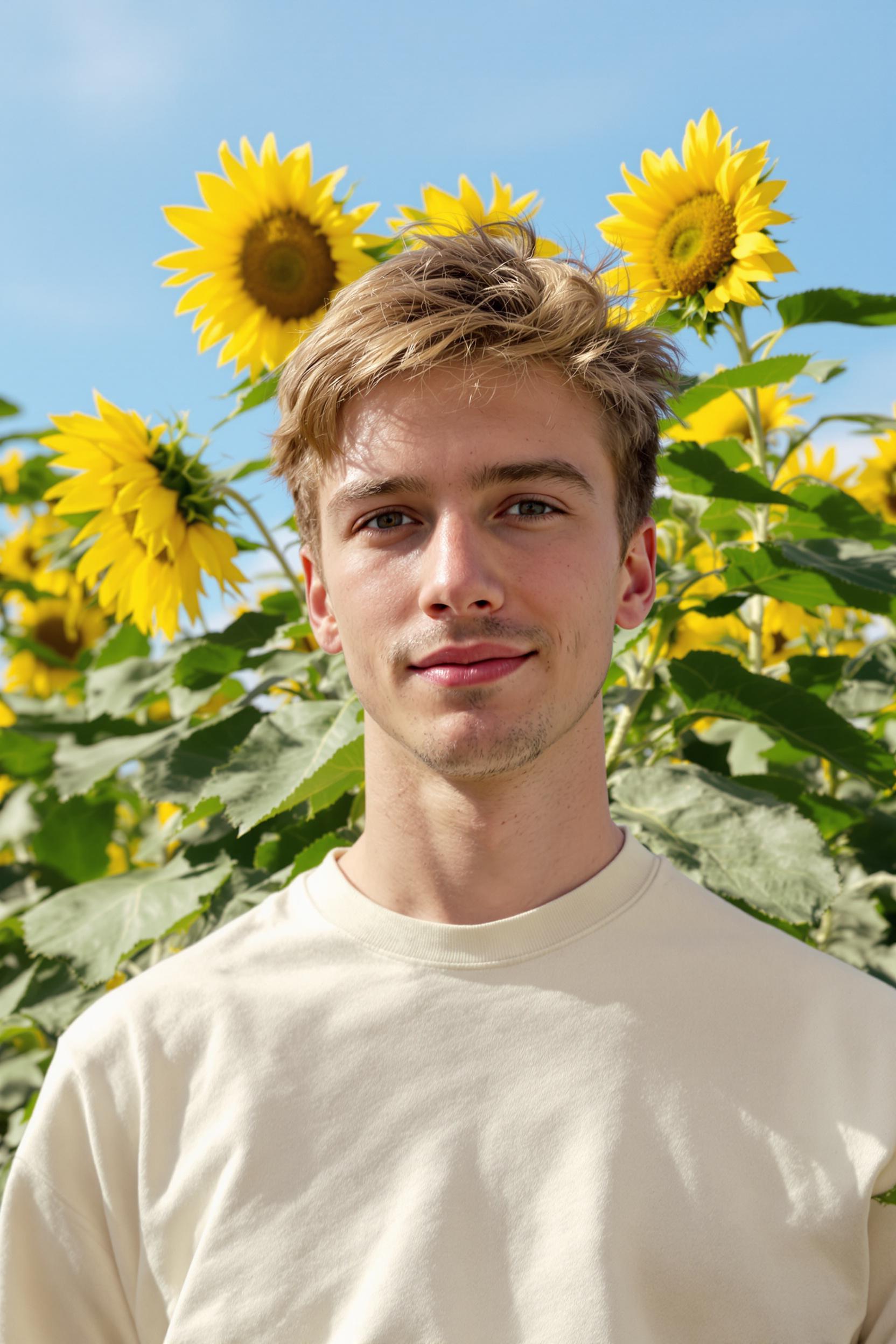Мужчина в светлой футболке стоит на фоне цветущих подсолнухов, его взгляд устремлён прямо в камеру, на лице лёгкая улыбка. Летом солнце мягко освещает лицо, позади жёлтые цветы под голубым небом. Средний план, тёплая атмосфера и свежесть летнего дня.