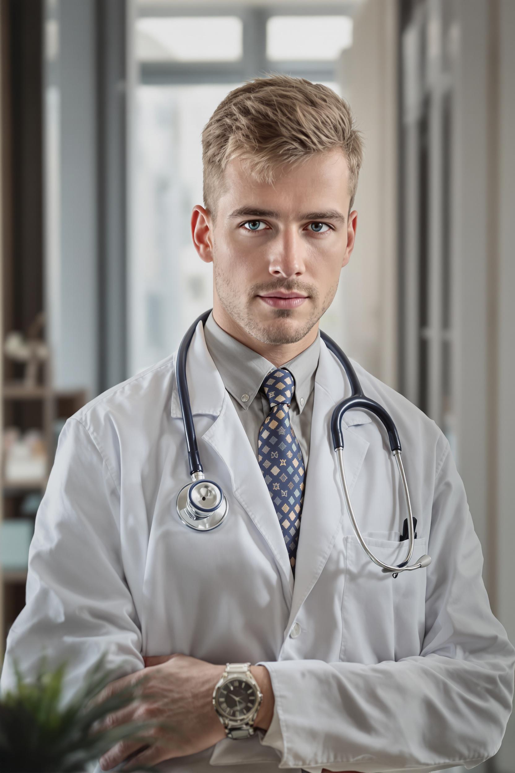 Примерить образ на себеМолодой врач в белом халате стоит в светлом медицинском кабинете, держит стетоскоп, уверенно смотрит в камеру, на фоне медицинского оборудования, профессиональная атмосфера.