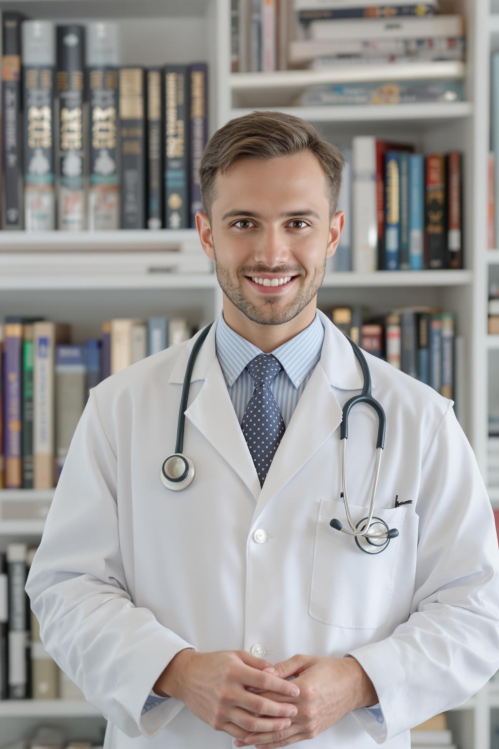 Молодой врач в белом халате стоит в светлом медицинском кабинете, фон — стеллаж с медицинскими книгами, он смотрит в камеру с уверенной улыбкой, в руках стетоскоп.