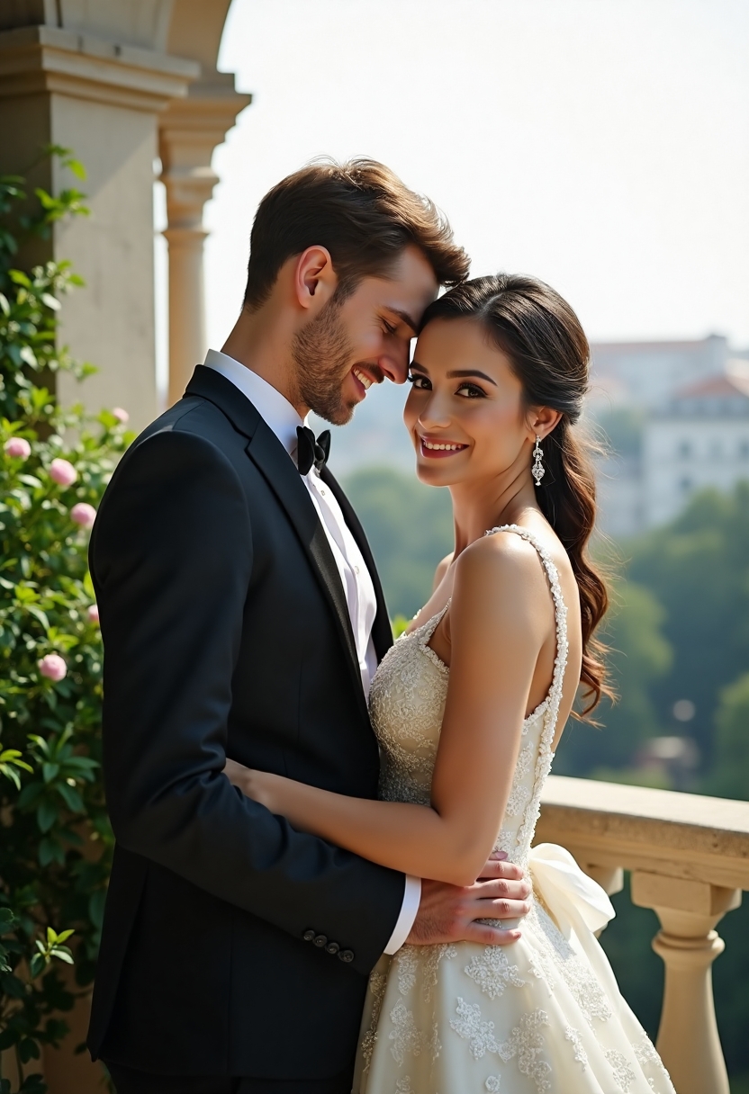 Молодожёны в изысканных костюмах стоят бок о бок на террасе с видом на городской парк, их головы слегка наклонены друг к другу, оба смотрят в камеру и улыбются, вокруг зелёные насаждения и архитектурные детали, мягкий дневной свет.