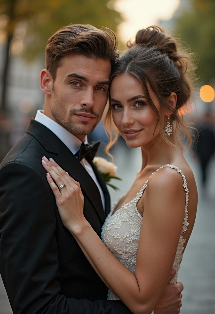 Примерить образ на себеДвое молодых людей в утончённых свадебных нарядах стоят рука об руку на фоне старинной городской улицы с архитектурными элементами, оба смотрят с любовью в камеру, вокруг лёгкий городской трафик и элегантные деревья, мягкий дневной свет.