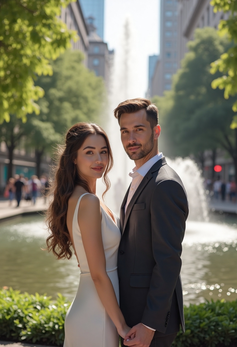 Молодожёны в современном стиле стоят на фоне городского фонтана, держатся за руки и слегка повернуты друг к другу, смотрят прямо в камеру, вокруг городская суета и зелёные насаждения, мягкий дневной свет, ощущение радости.