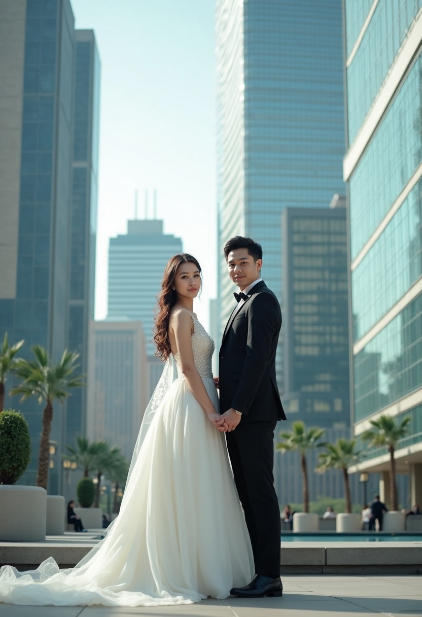 Молодожёны в стильных свадебных нарядах стоят бок о бок на фоне сверкающего стеклянного фасада небоскрёба, держатся за руки, оба уверенно смотрят прямо в камеру, вокруг городской пейзаж, утренний чистый свет, атмосфера единения на высоте.