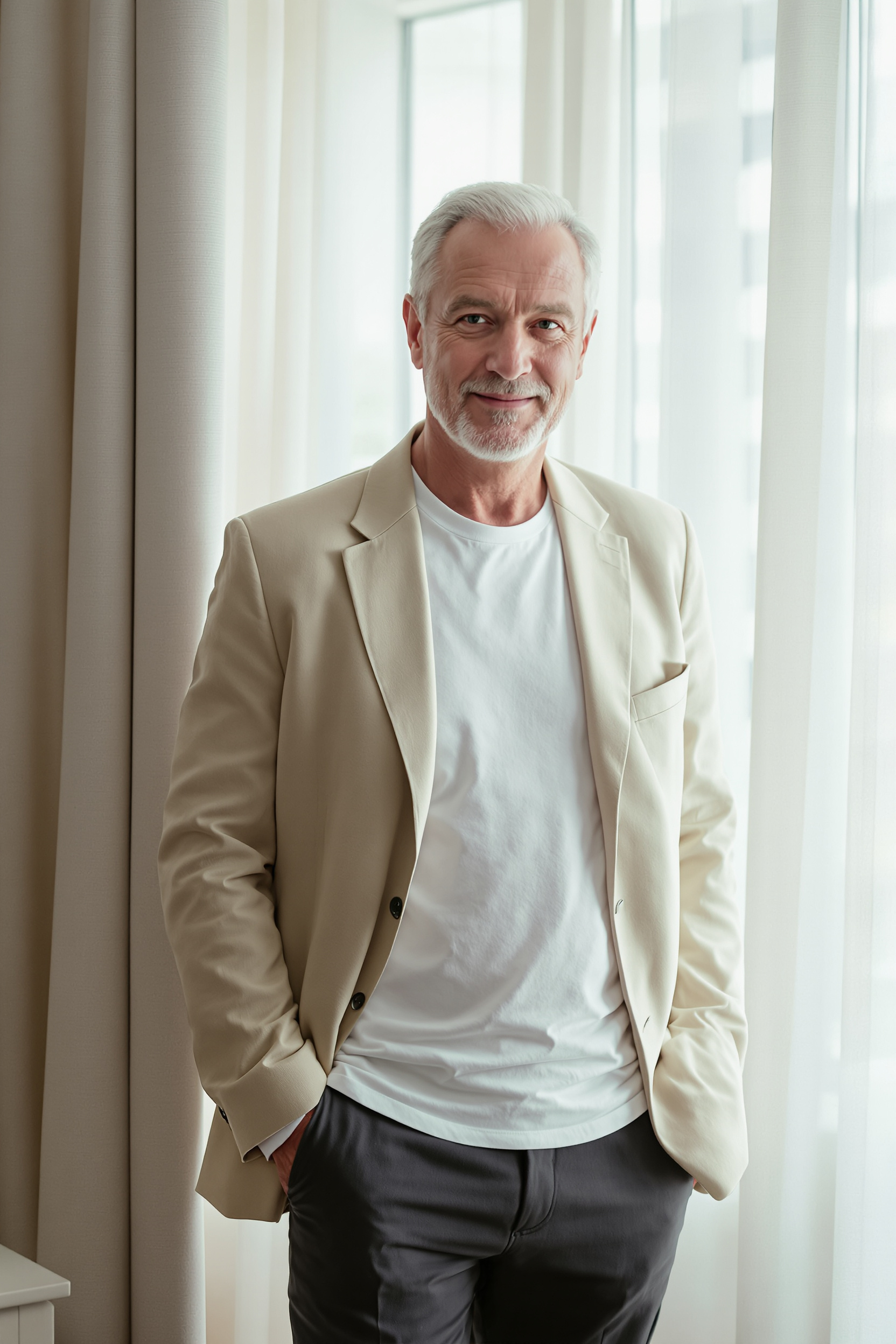 Мужчина 50-60 лет в бежевом льняном пиджаке и белой футболке, темные повседневные брюки, стоит на фоне окна с легкими шторами, средний план, смотрит в камеру, естественный мягкий свет, уютная атмосфера современного интерьера.