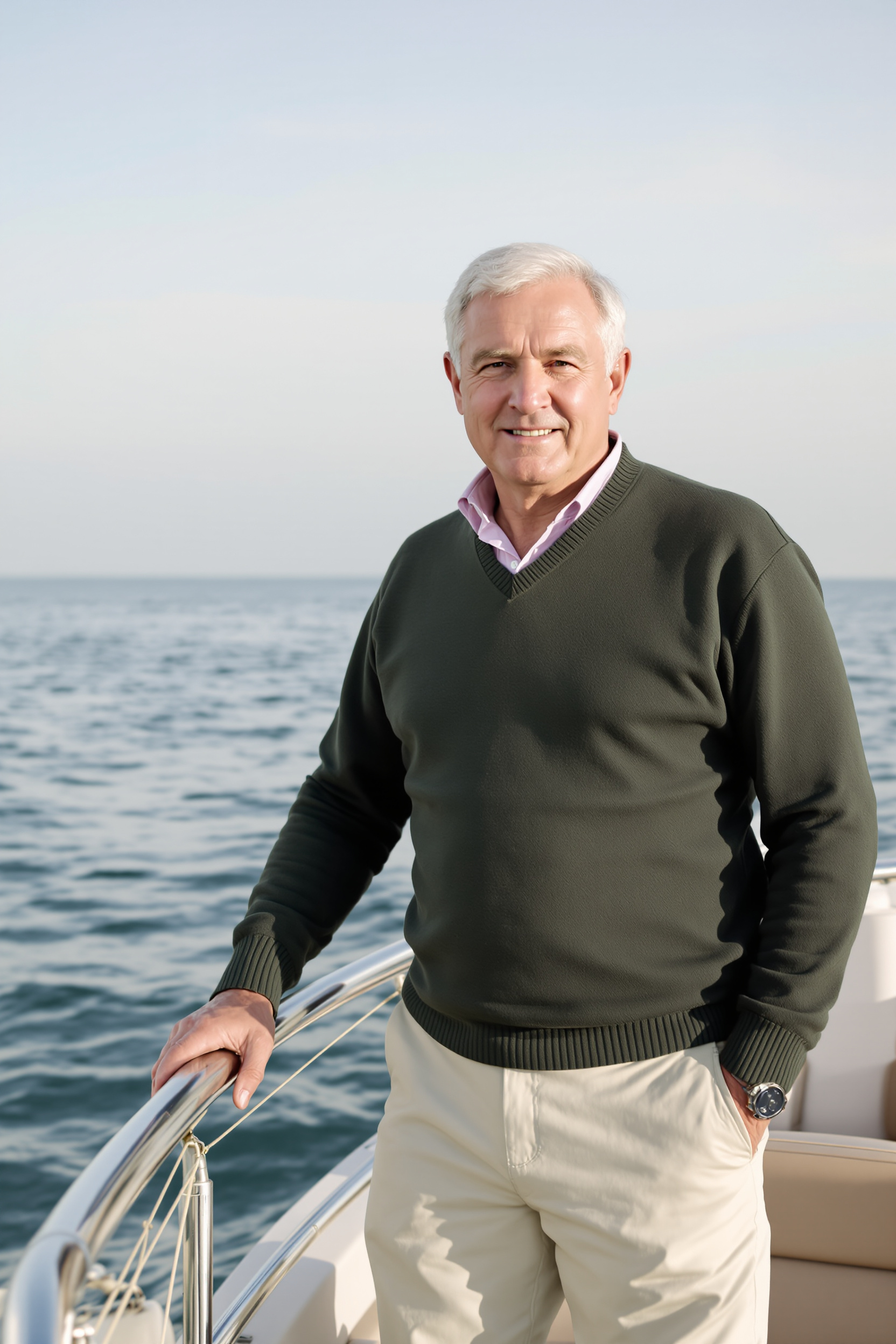 Мужчина 50-60 лет в мягком темно-зеленом шерстяном свитере и светлых хлопковых брюках стоит на палубе стильной моторной лодки, держит одну руку на поручне, смотрит прямо в камеру, средний план, вокруг гладкая вода и легкий утренний свет, атмосфера путешествия.