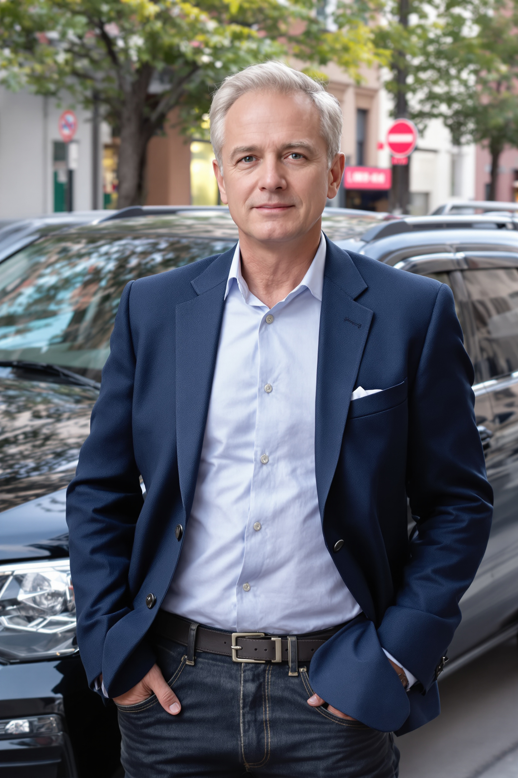 Мужчина 50-60 лет в синем блейзере и светлой хлопковой рубашке без галстука, тёмные джинсы, стоит у черного внедорожника на фоне городской улицы, слегка опирается на капот, средний план, уверенно смотрит в камеру, мягкий дневной свет.