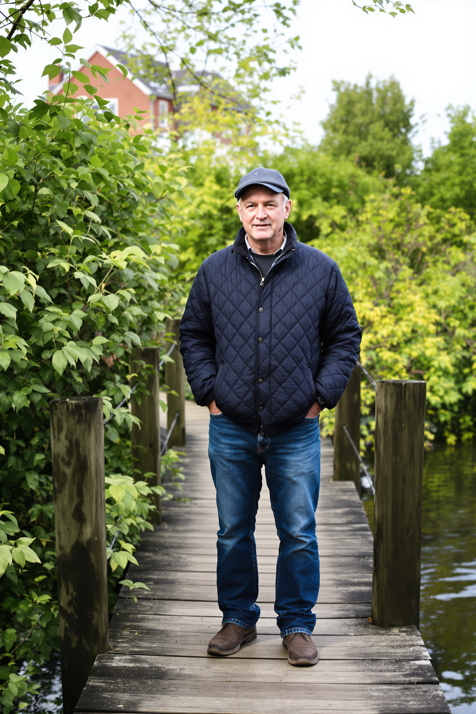 Мужчина 50-60 лет в стеганой темно-синей куртке и джинсах, суконная кепка, стоит на деревянном пирсе у реки, вокруг зелёные кусты и спокойная вода, средний план, смотрит прямо в камеру, утренний рассеянный свет, атмосфера умиротворённости.