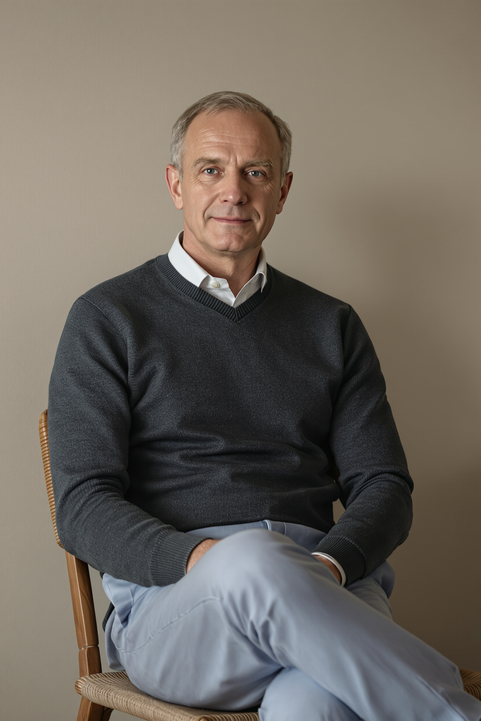 Мужчина 50-60 лет в строгом темно-сером пуловере и светло-синих классических брюках сидит на деревянном стуле у нейтральной гладкой стены, средний план, смотрит прямо в камеру, спокойный свет, атмосфера доверия и сдержанной элегантности.