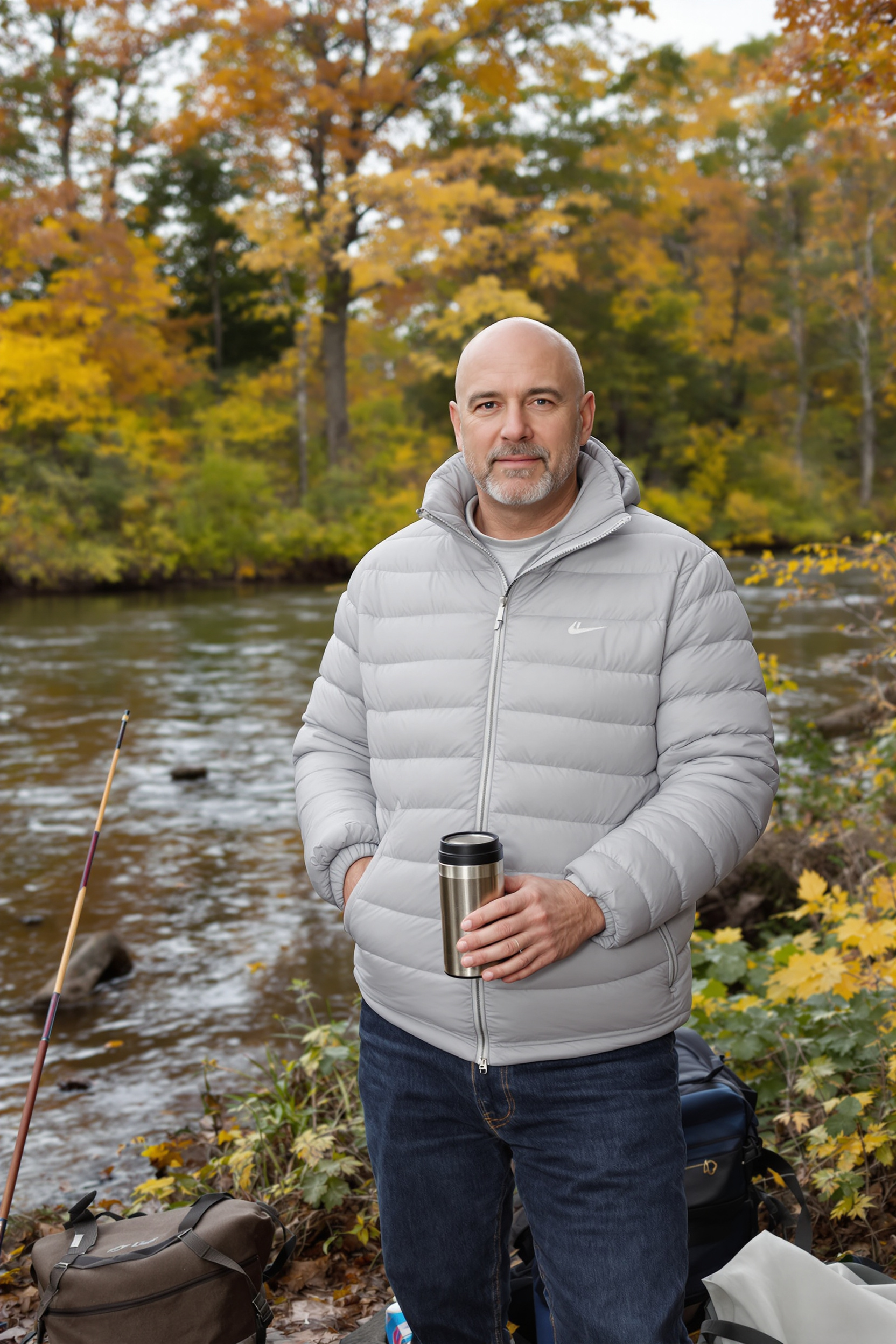 Мужчина 50-60 лет в светло-сером пуховике и темно-синих джинсах стоит у реки на фоне осенних деревьев, в руках термос, рядом рыбацкий рюкзак, средний план, внимательно смотрит прямо в камеру, естественный дневной свет, атмосфера спокойного отдыха на природе.