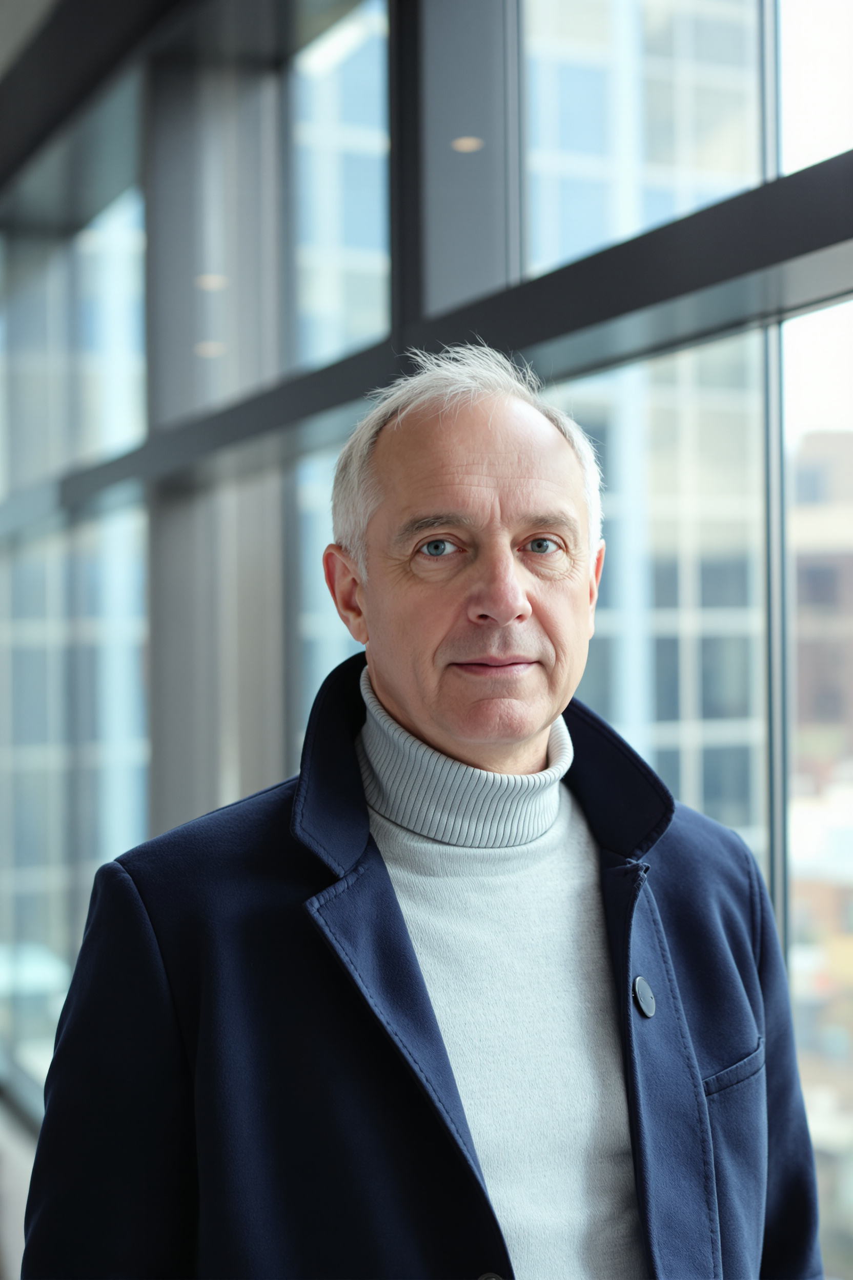 Мужчина 50-60 лет в светло-серой водолазке и темно-синем жакете, стоит на фоне большого окна с видом на город, средний план, смотрит в камеру, мягкий рассеянный свет, атмосферная деловая простота.