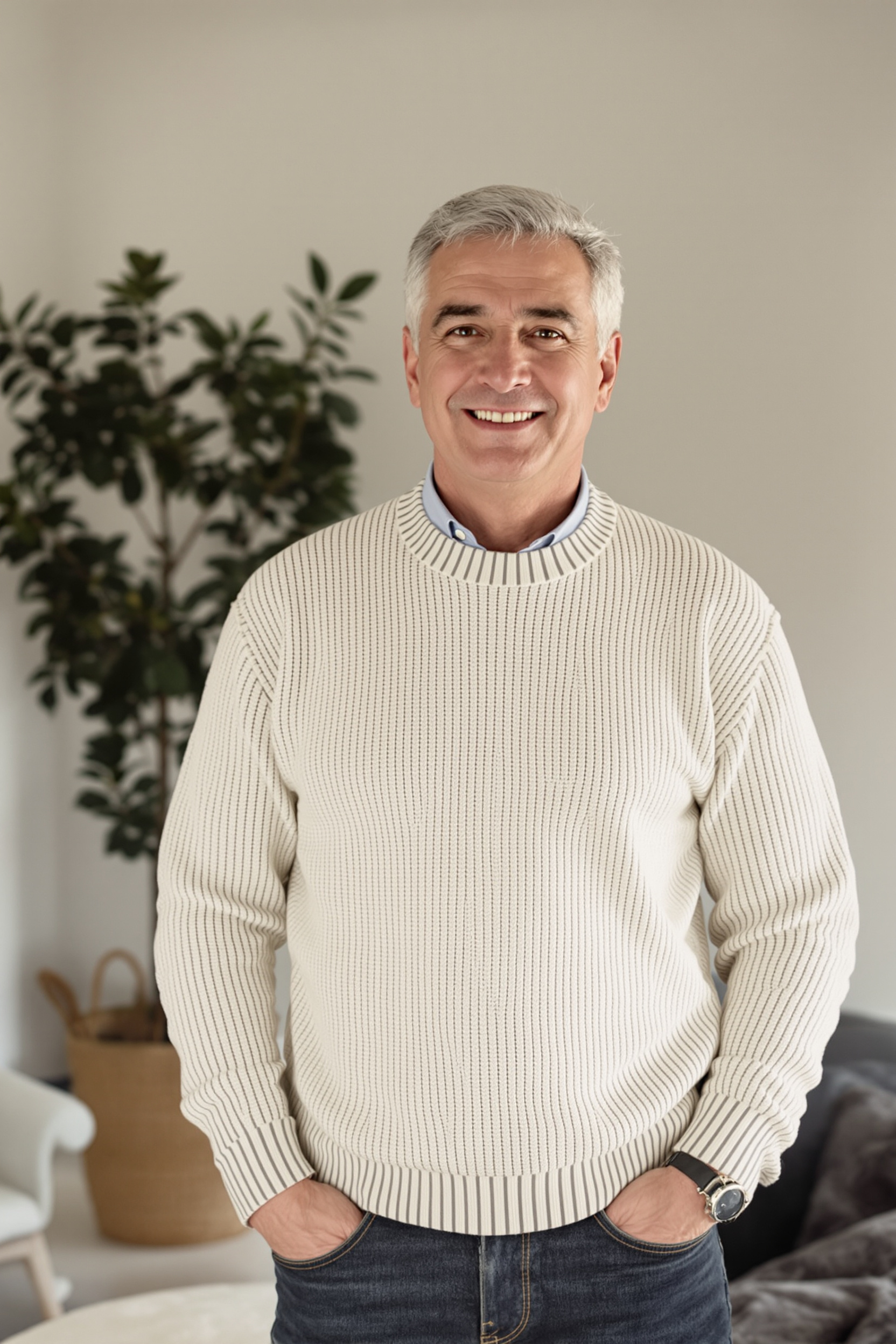 Мужчина 50-60 лет в светлом вязаном свитере и темных джинсах, на фоне уютного минималистичного интерьера, средний план, смотрит в камеру, атмосфера уюта и уверенности, деликатное естественное освещение
