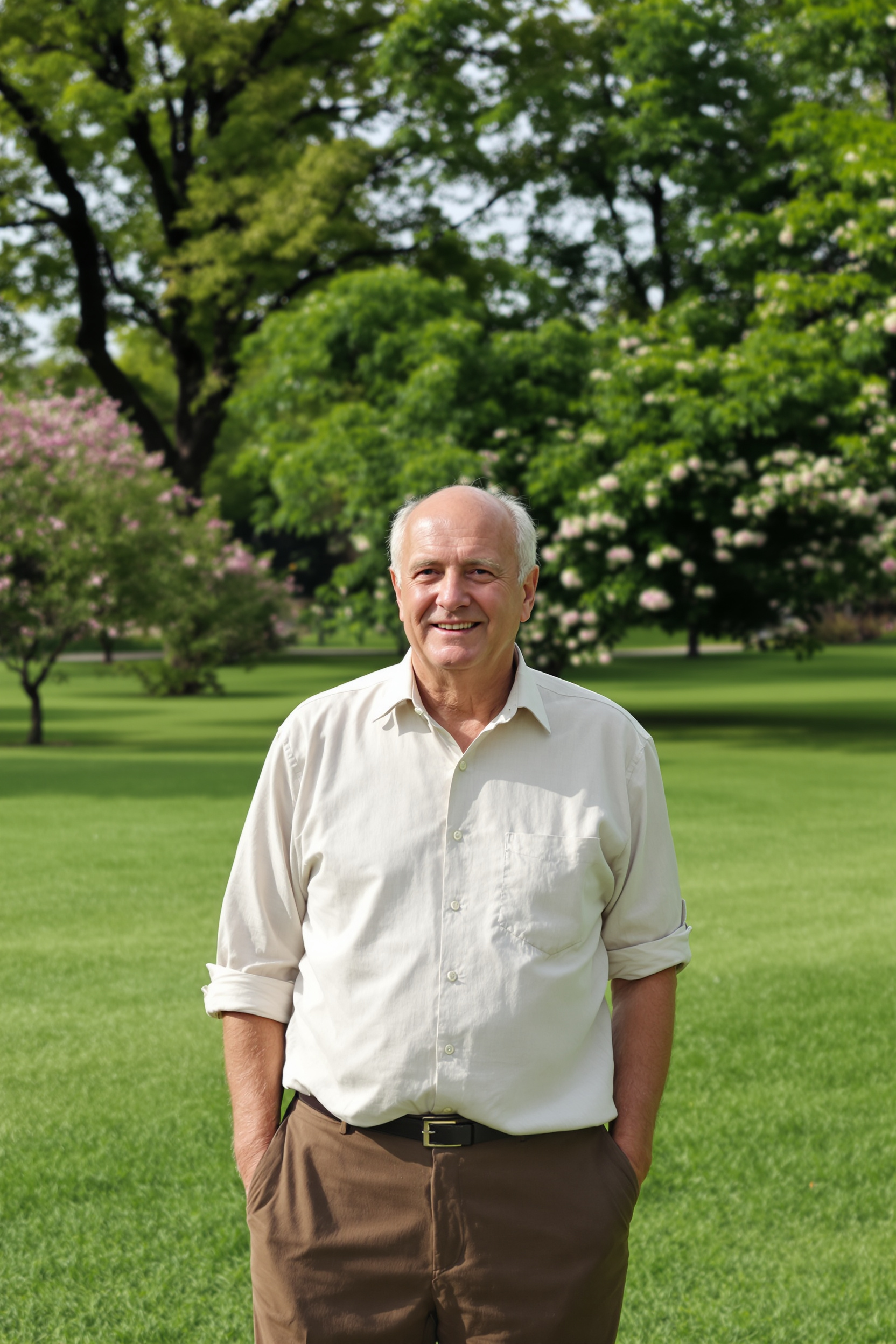 Мужчина 50-60 лет в светлой льняной рубашке и коричневых брюках стоит на зеленой лужайке в парке, за ним деревья и цветущие кустарники, средний план, смотрит прямо в камеру, естественный дневной свет, атмосфера спокойствия на природе.