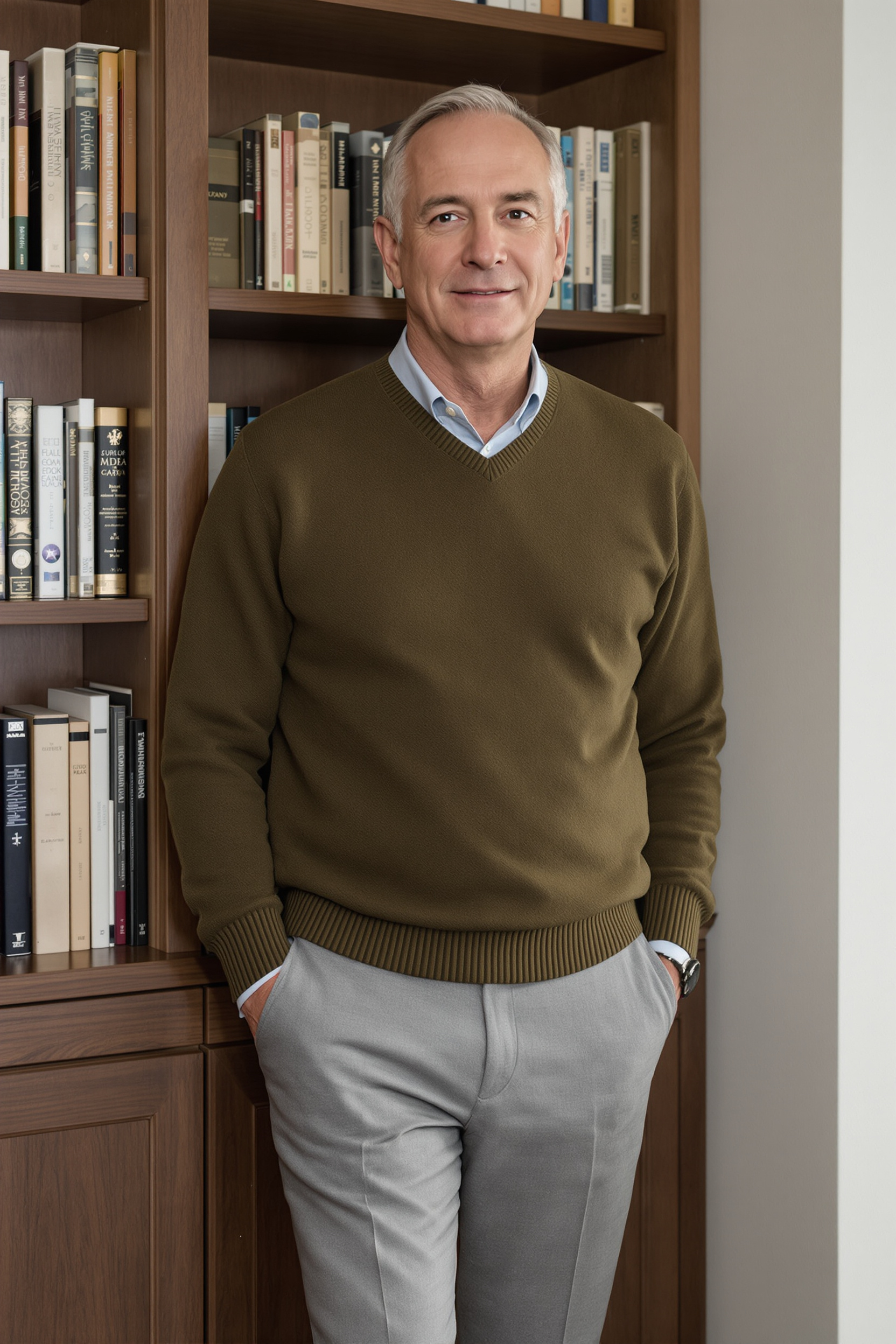 Мужчина 50-60 лет в темно-оливковом кашемировом свитере и классических серых брюках стоит у книжного шкафа с деревянными полками, средний план, смотрит прямо в камеру, спокойная, уютная атмосфера, мягкий рассеянный свет.