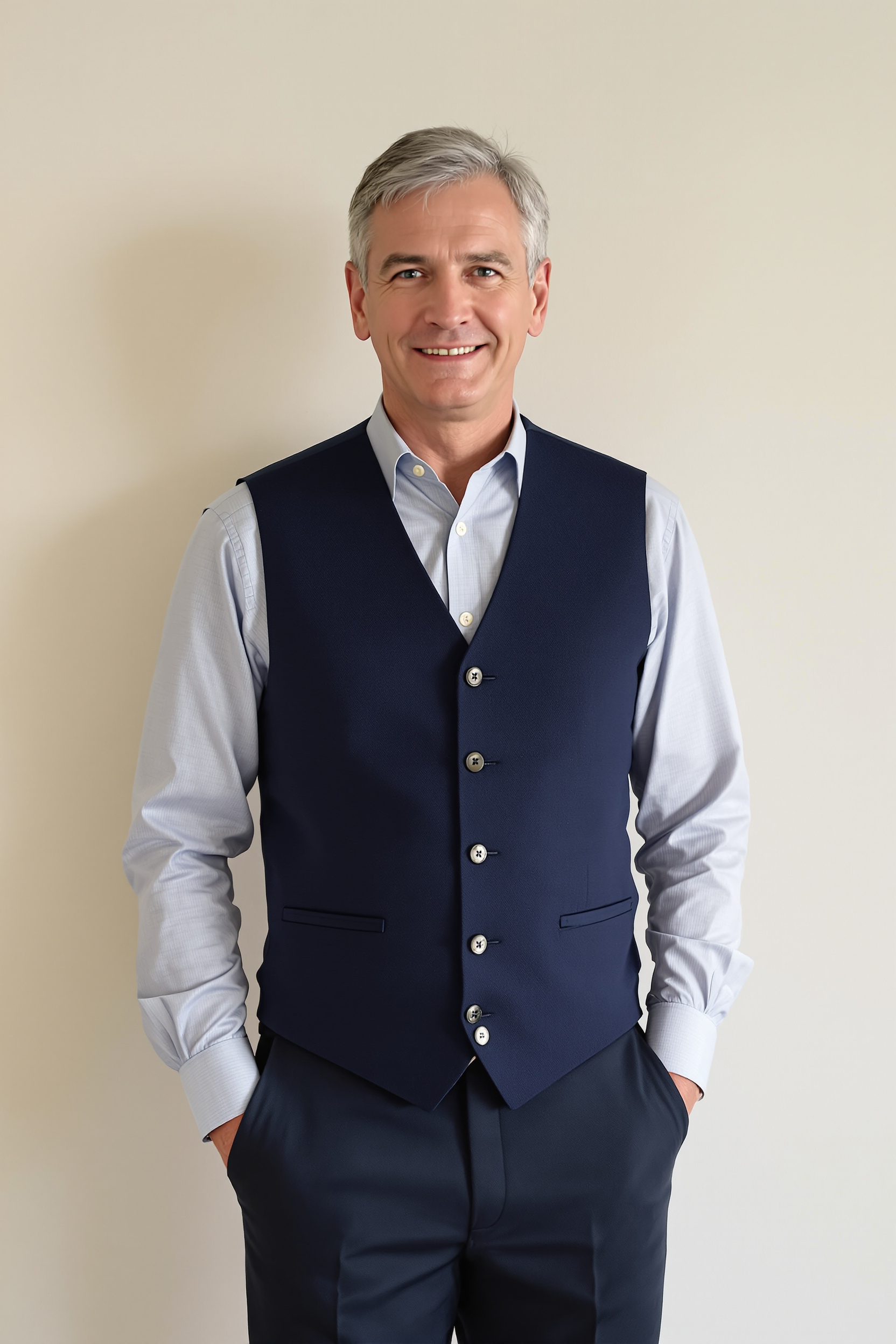 Мужчина 50-60 лет в темно-синей жилетке на пуговицах поверх светло-серой рубашки, темные классические брюки, стоит у гладкой однотонной стены, средний план, смотрит в камеру, утонченный деловой стиль, естественное освещение.