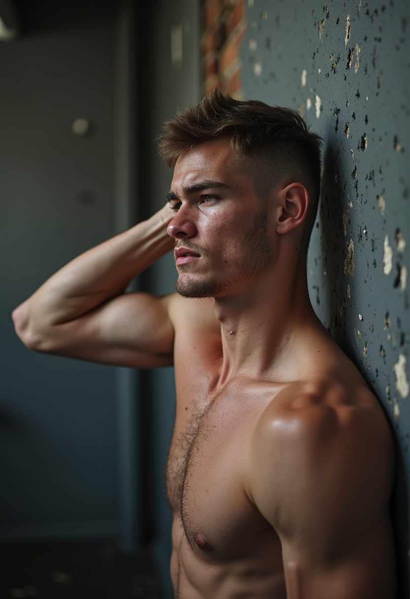 Мужчина-боец ММА делает разминку у стены, выполняя растяжку. На нём только тренировочные шорты, мышцы напряжены, лицо — в каплях пота, выражение сосредоточенное. Крупный план.