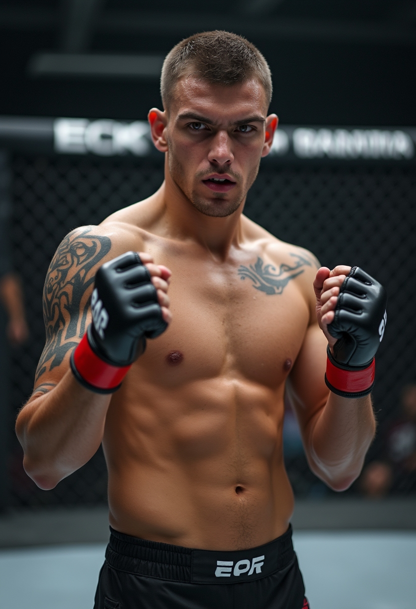 Мужчина-боец ММА стоит в клетке в боевой стойке, на нём тренировочные шорты, голый торс, руки в чёрных перчатках. Его лицо напряжённо и сфокусировано, на лбу капли пота, татуировки на плечах. Крупный план, акцент на энергии и готовности.