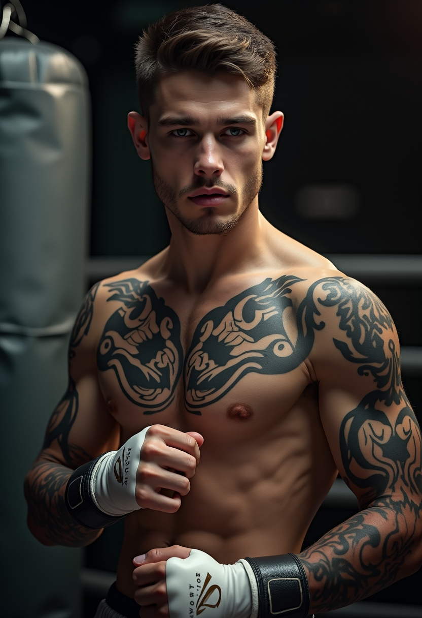 Примерить образ на себеМужчина-боксёр на фоне стального мешка готовится надеть капу, его взгляд жёсткий и волевой, татуировки видны на груди и предплечьях. Крупный план, светотени усиливают драму.