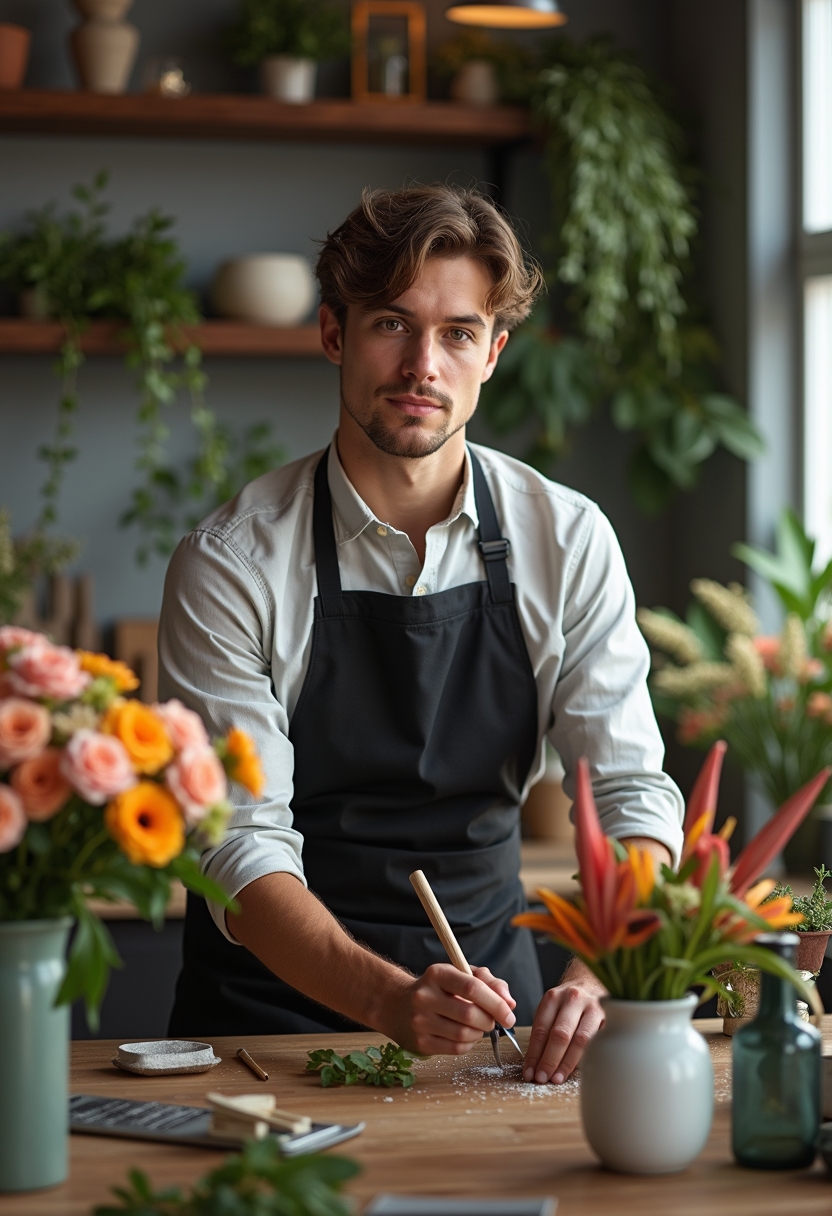 Мужчина-флорист в чёрном фартуке и светлой рубашке оформляет композицию из экзотических цветов на высоком столе. Он смотрит в камеру внимательно, вокруг — инструменты и вазы. Крупный план.