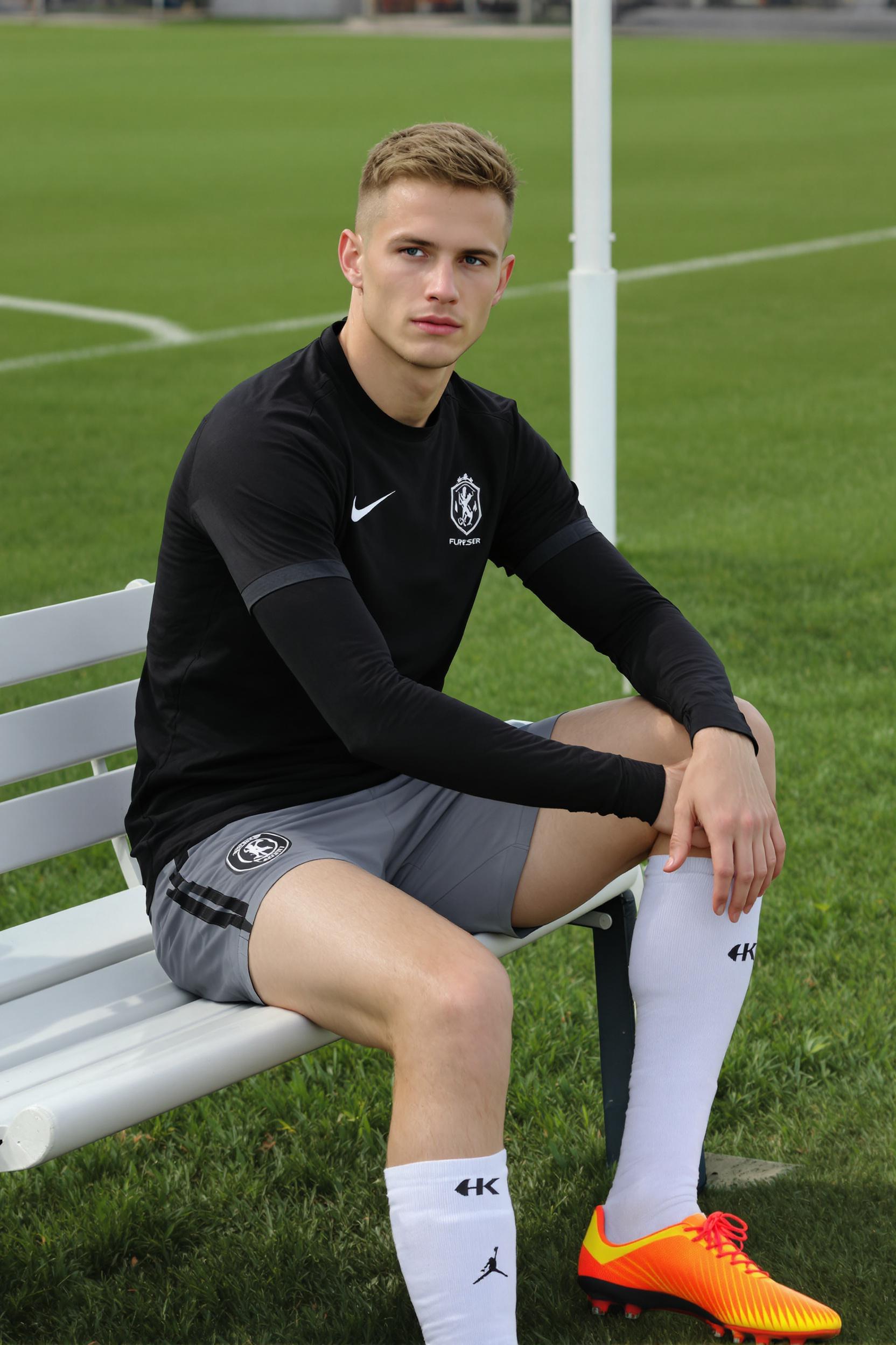 Мужчина-футболист сидит на газоне возле линии поля, одет в строгую чёрную тренировочную футболку, серые шорты и белые гетры с логотипом клуба, бутсы насыщенного цвета, обеими руками опирается на простую скамейку рядом, смотрит прямо в камеру, минималистичный фон, средний план.