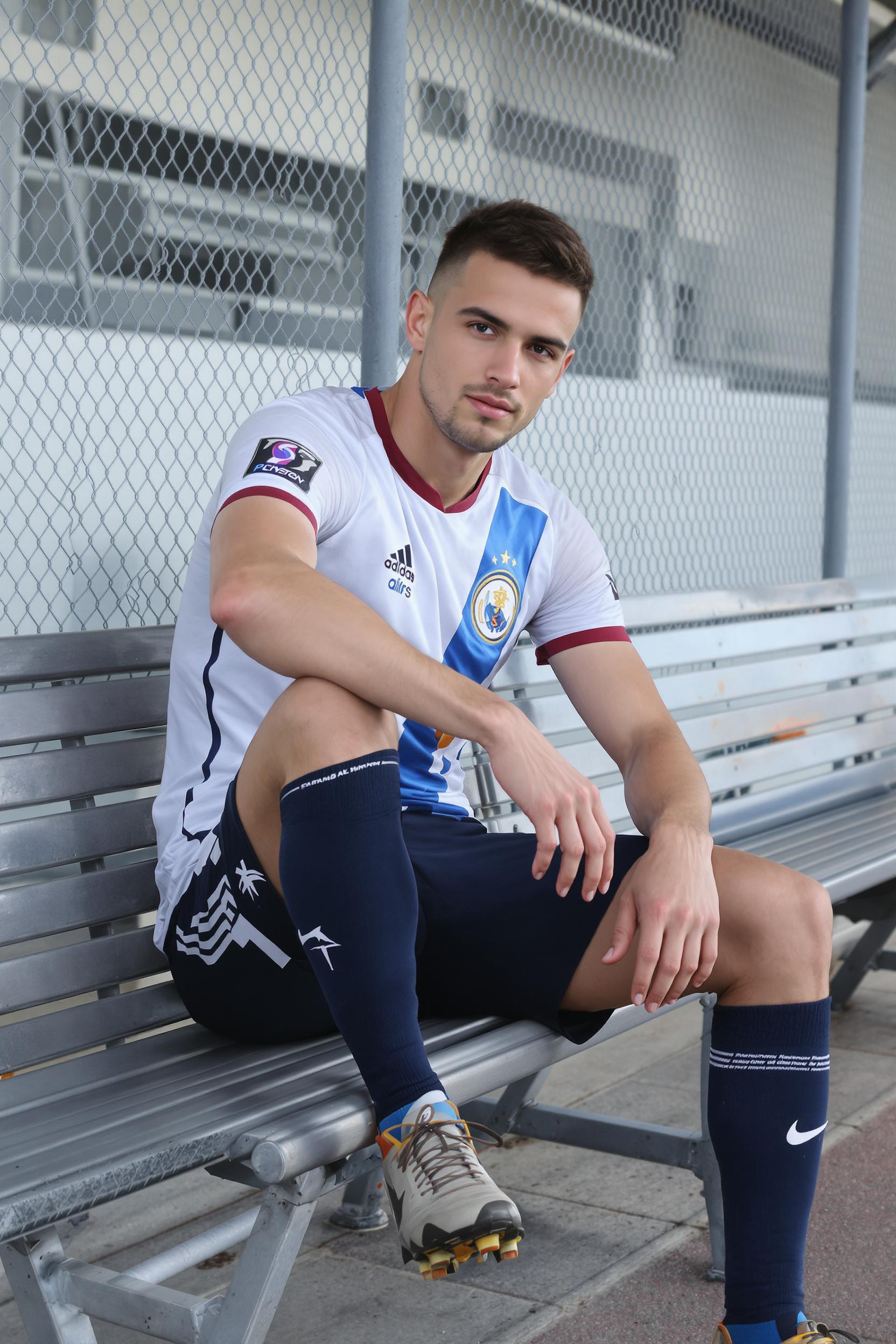 Мужчина-футболист сидит на металлической скамейке возле боковой линии поля, одет в фирменную бело-синюю футболку, тёмные шорты, высокие гетры, бутсы с контрастными вставками, локтем опирается на спинку, уверенно смотрит в камеру, минималистичный фон, средний план.