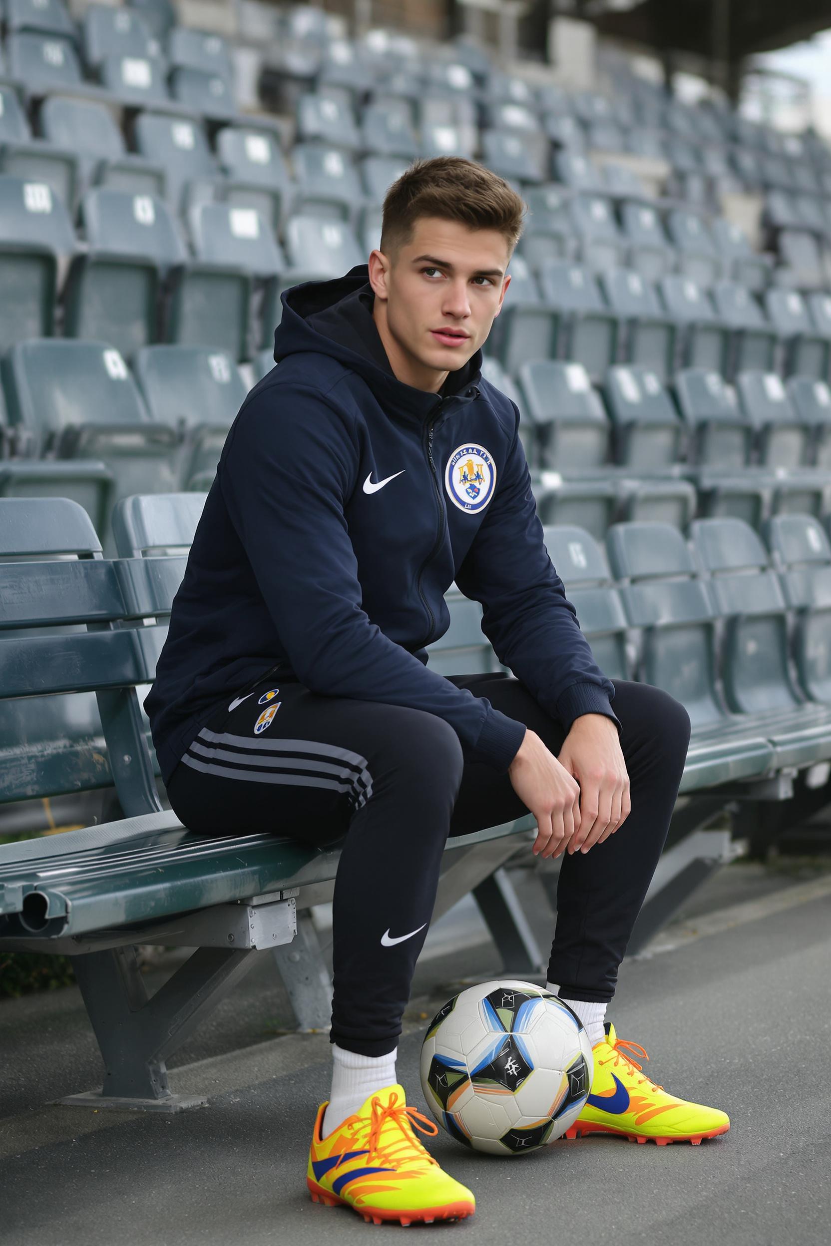 Мужчина-футболист сидит на скамейке запасных стадиона, одет в тёмную тренировочную куртку с эмблемой команды, спортивные штаны, яркие бутсы, на коленях лежит футбольный мяч, смотрит сосредоточенно в камеру, средний план.