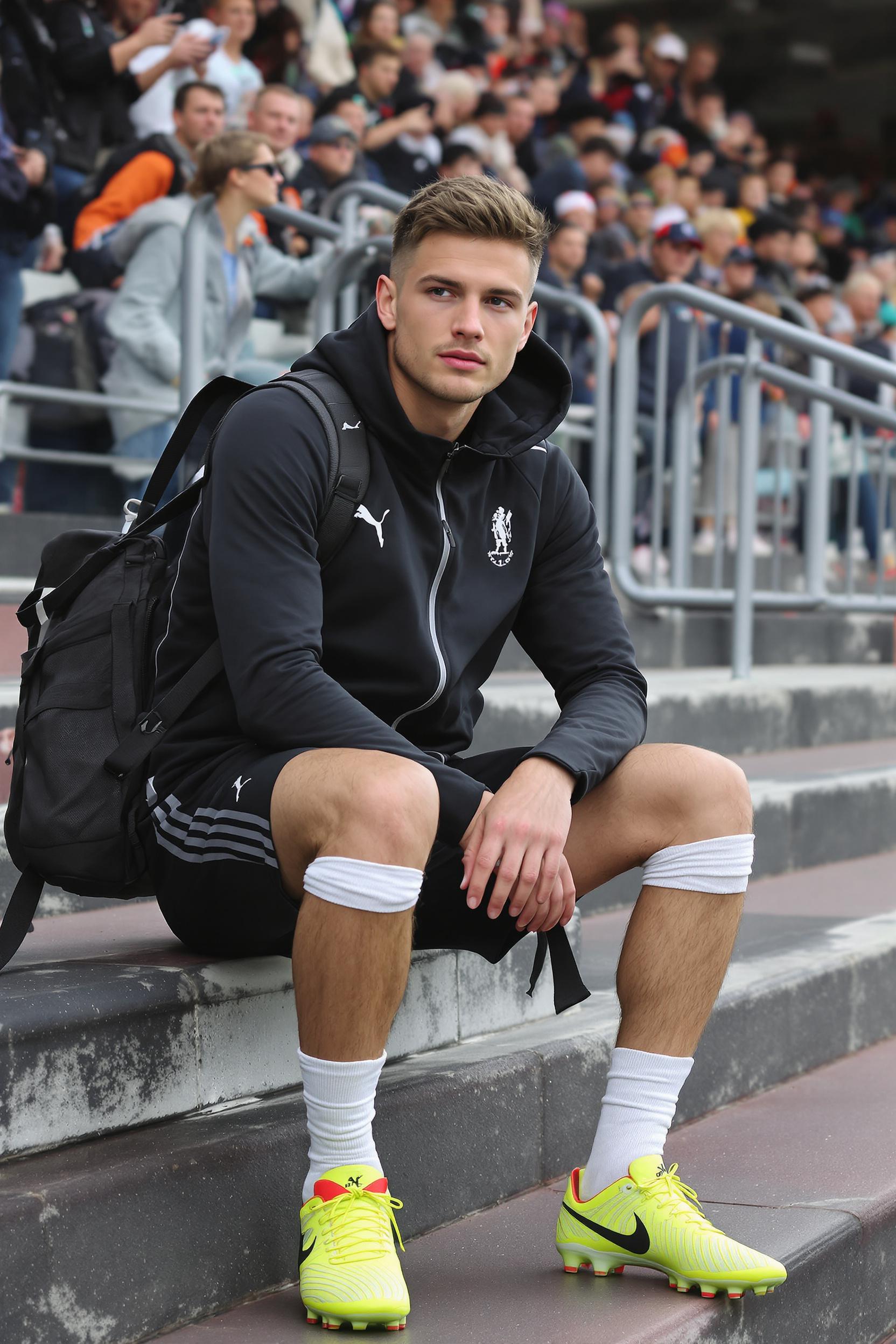 Мужчина-футболист сидит на ступенях трибун, одет в стильную тренировочную олимпийку с молнией, черные шорты, белые гетры и яркие бутсы, на плечах спортивная сумка, вокруг толпа болельщиков, внимательно смотрит в камеру, средний план.