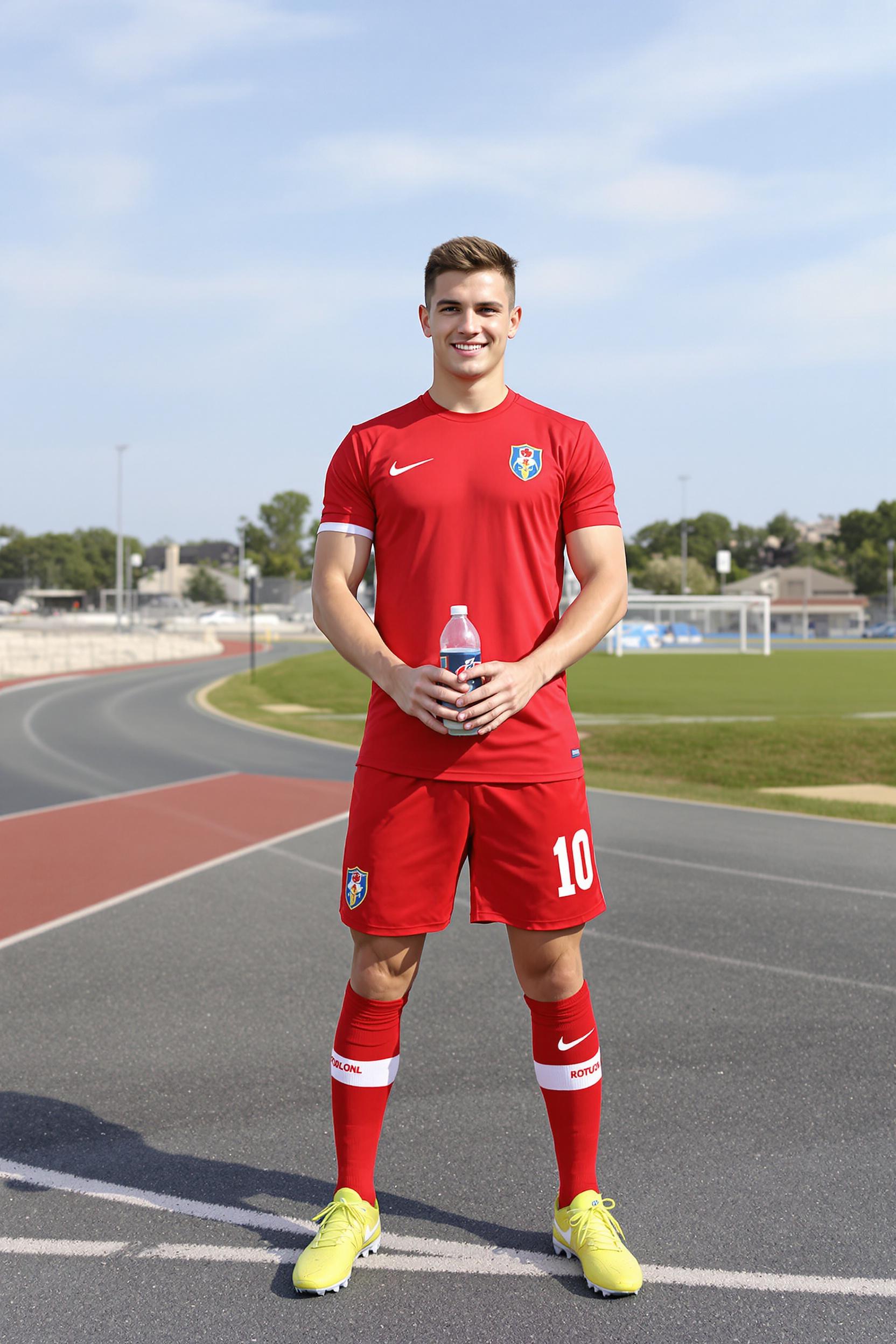 Мужчина-футболист стоит на беговой дорожке у кромки футбольного поля, одет в красную форму с коротким рукавом, шорты, контрастные гетры и современные бутсы, на поясе закреплён номер, держит в руках бутылку спортивного напитка, смотрит с улыбкой в камеру, средний план.