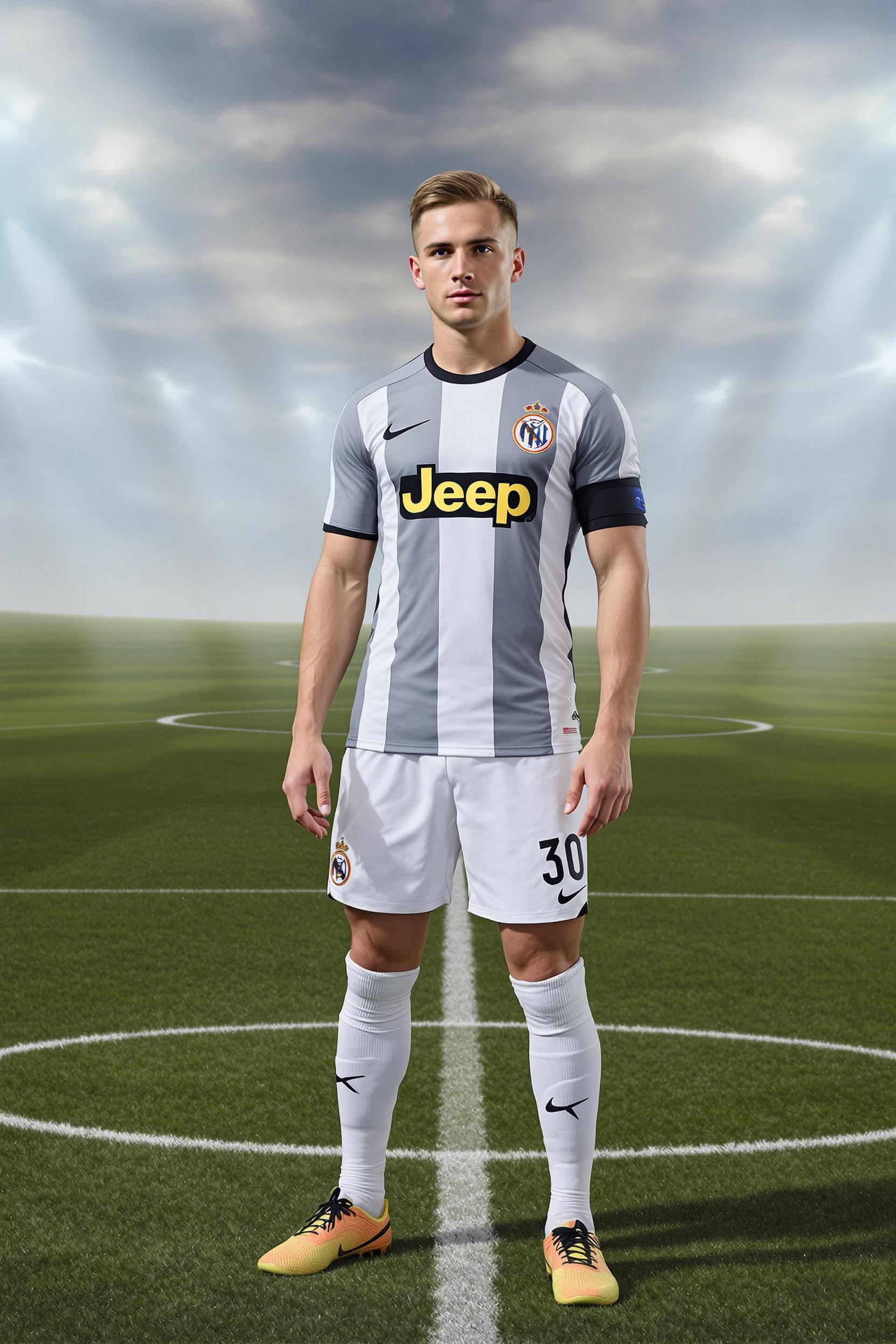 Мужчина-футболист стоит на фоне центрального круга футбольного поля, одет в новую клубную форму: короткая футболка с эмблемой, классические шорты, высокие гетры, яркие бутсы, на одну руку надет защитный налокотник, с уверенным взглядом смотрит в камеру, средний план.