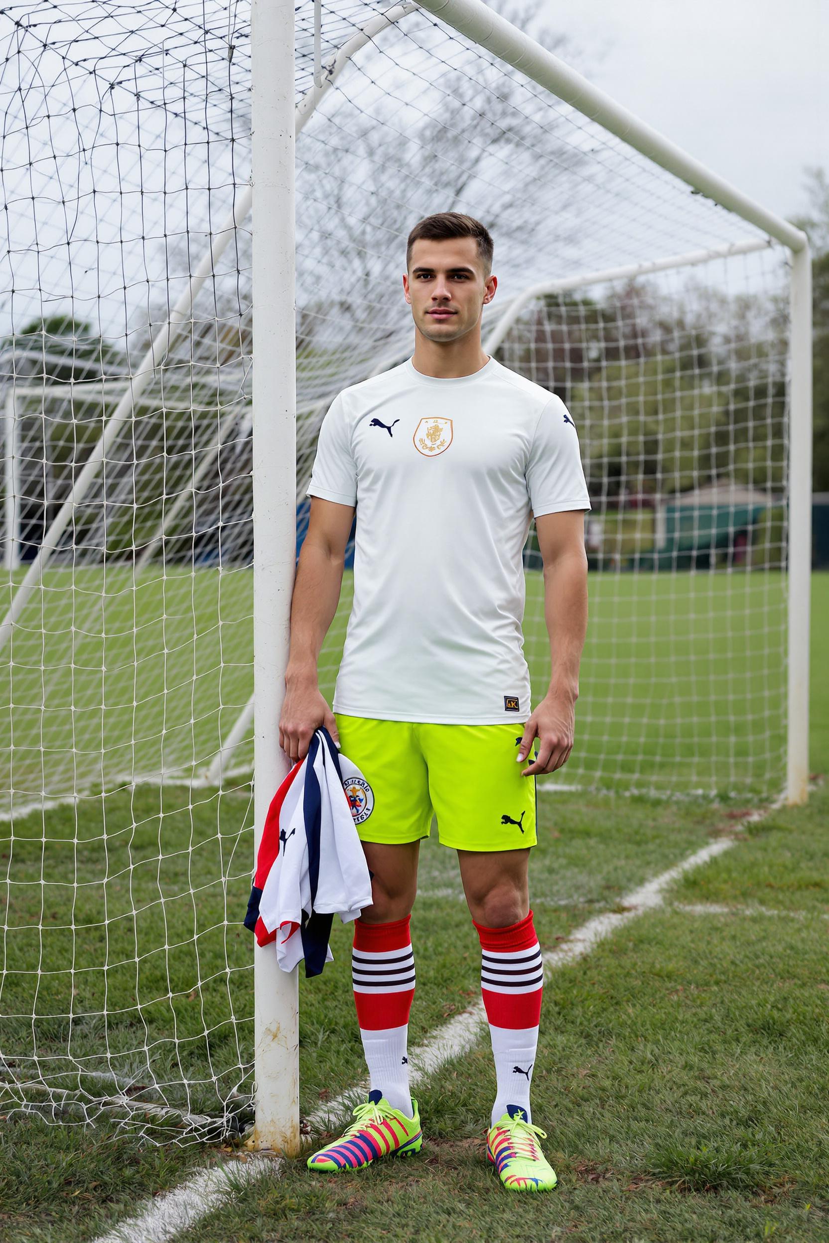 Мужчина-футболист стоит на фоне опоры ворот, одет в лёгкую тренировочную футболку с коротким рукавом, яркие шорты, гетры с контрастными полосами, крепкие бутсы, в одной руке держит форму команды, уверенно смотрит в камеру, средний план.