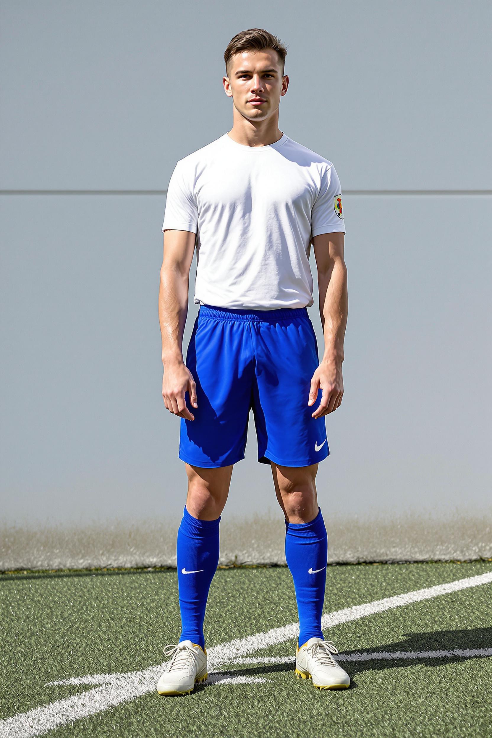 Мужчина-футболист стоит на краю чистого футбольного поля с минималистичным фоном, одет в белую футболку с коротким рукавом, ярко-синие шорты, длинные гетры и светлые бутсы, руки опущены вдоль тела, уверенно смотрит в камеру, средний план.