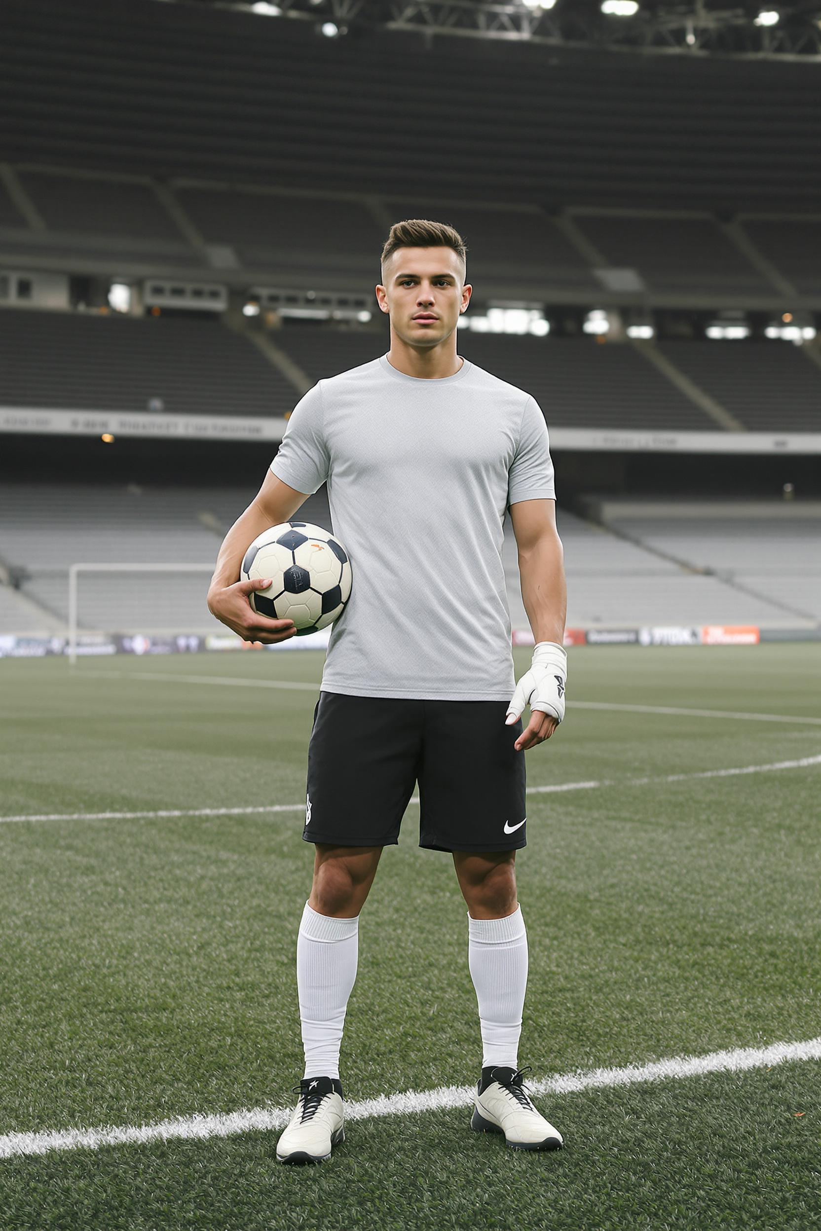 Мужчина-футболист стоит на краю футбольного поля на фоне пустых секторов трибун, одет в светло-серую тренировочную футболку, темные шорты, белые гетры и классические бутсы, держит мяч под рукой, смотрит прямо в камеру, минималистичный фон, средний план.