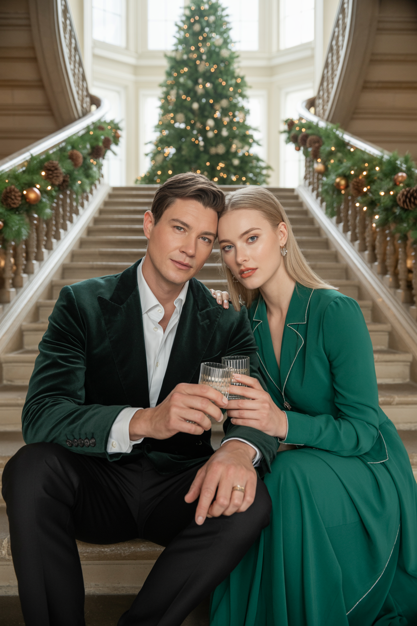 Мужчина и женщина в просторном холле загородного дома рядом с высокой искусственной ёлкой, мужчина в темно-зеленом бархатном пиджаке, белой рубашке и классических черных брюках, женщина в изумрудном платье с длинным рукавом и серебряными акцентами. Они сидят на широкой лестнице, плечами соприкасаясь, держат в руках новогодние бокалы, оба смотрят в камеру, вокруг мягкий свет гирлянд и шишки на перилах.