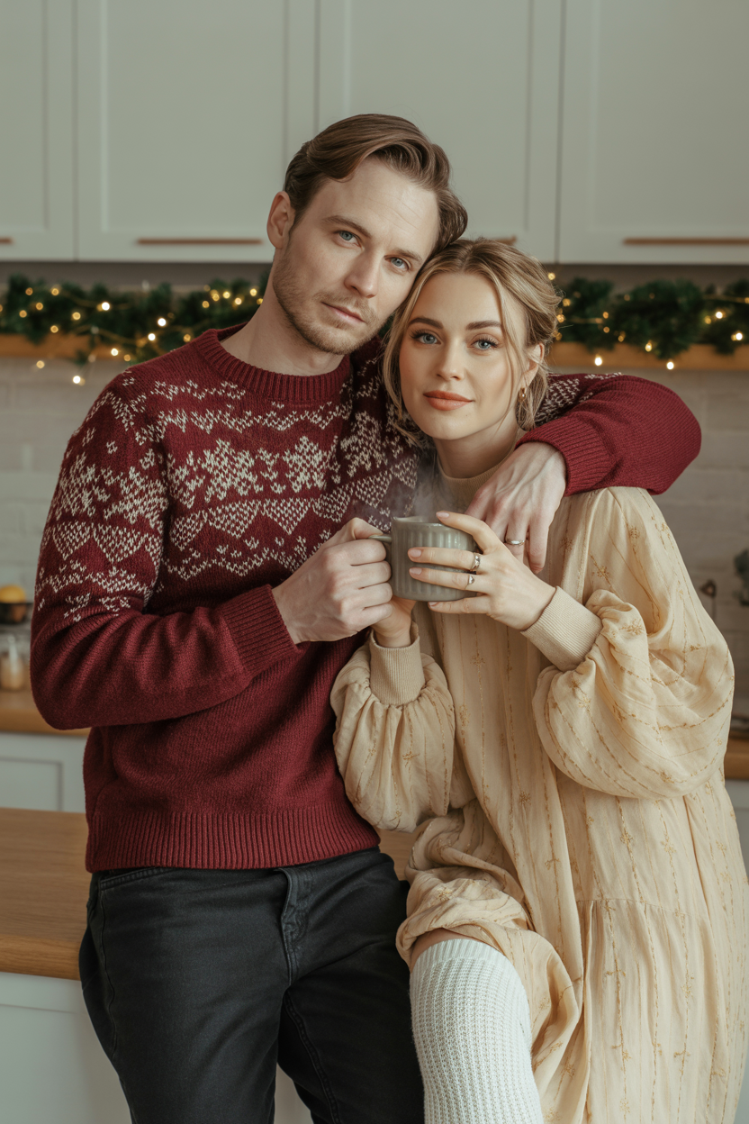 Мужчина и женщина в современной кухне у наряженной ёлки, мужчина в бордовом свитере с белым скандинавским орнаментом и чёрных джинсах, женщина в молочно-бежевом платье с золотистой вышивкой и тёплых чулках. Они стоят бок о бок, мужчина обнимает женщину за талию, оба смотрят прямо в камеру, в руках кружки с какао, вокруг уютная атмосфера и мягкий свет гирлянд.