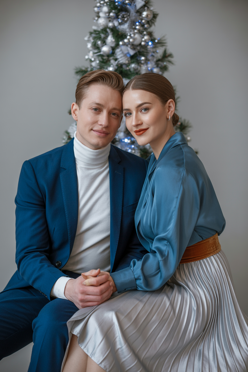 Мужчина и женщина в стильной фотостудии с минималистичным декором, рядом современная искусственная ёлка в серебристых и синих тонах. Мужчина в темно-синем костюме с белой водолазкой, женщина в асимметричной юбке-трапеции из серебряной ткани и элегантной синей блузе с бархатным поясом. Оба сидят на полу, соприкасаясь спинами, скрестив ноги, держатся за руки и улыбаются в камеру, на фоне сверкает ёлочная гирлянда.