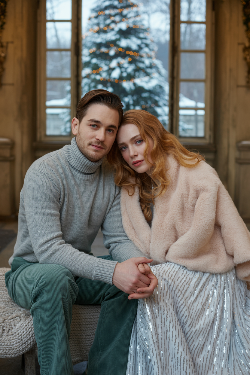 Мужчина и женщина в уютной лоджии у большой заснеженной ёлки, мужчина в светло-серой водолазке и вельветовых зелёных брюках, женщина в длинном белом платье с серебряными пайетками и меховой накидке. Сидят вплотную на деревянной скамье, держатся за руки, смотрят в камеру, на коленях лежит пушистый плед.