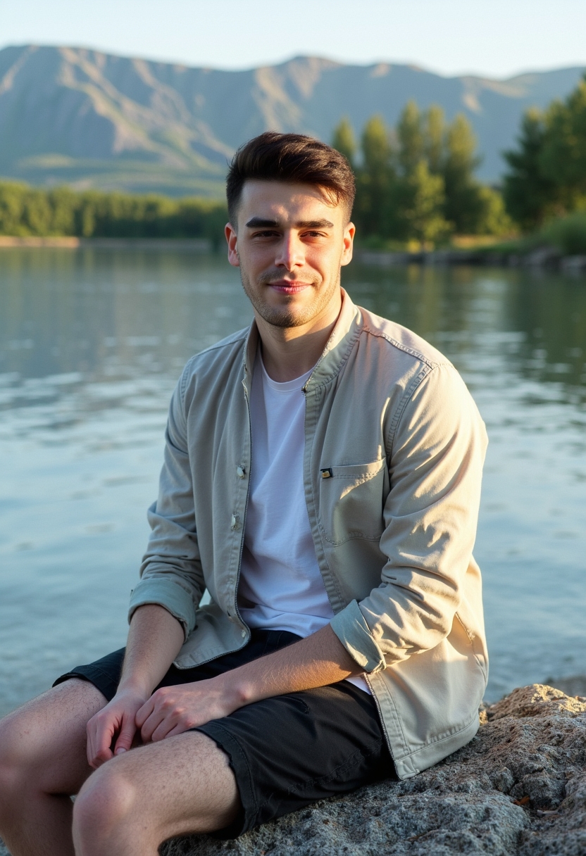 Мужчина летом сидит на каменистом берегу Байкала, его взгляд направлен вдаль на противоположные горы, отражающиеся в воде. Позади яркая зелень леса и мягкий свет закатного солнца. Крупный план, подчёркивающий безмятежность летнего дня на Байкале.