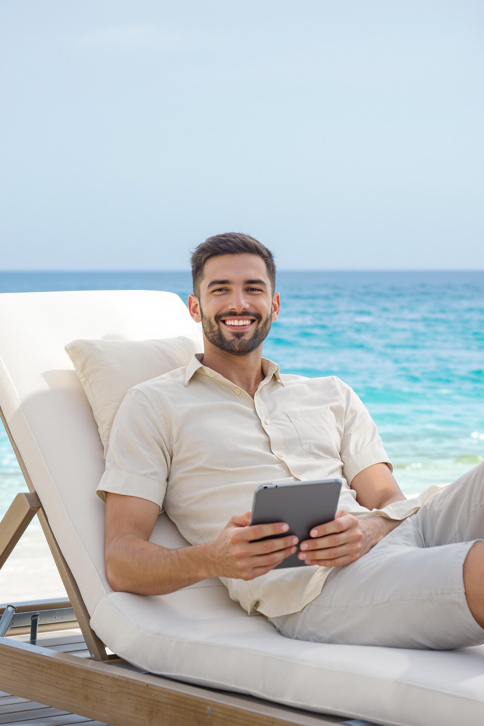 Мужчина лежит на широком светлом пляжном лежаке в бежевой льняной рубашке с короткими рукавами и светло-серых шортах. В руках держит планшет, на лице расслабленное выражение, он смотрит прямо в камеру. Позади лазурное море и чистое небо, средний план.