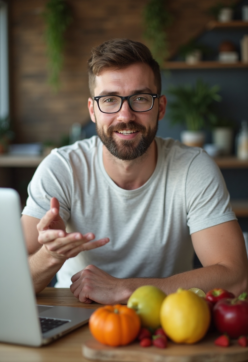 Мужчина-нутрициолог с бородой в светлой футболке и очках сидит за столом с фруктовой нарезкой и ноутбуком. Он объясняет что-то жестом, смотрит прямо в камеру. Крупный план.