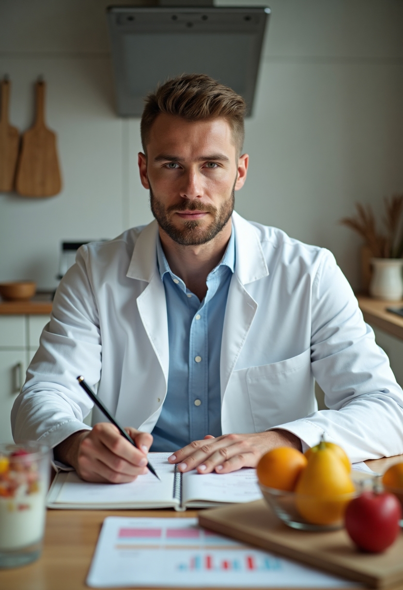 Мужчина-нутрициолог в белом халате сидит на кухне, на столе — миска с фруктами, график питания и бутылка воды. Он записывает что-то в блокнот, глядя в объектив. Крупный план.