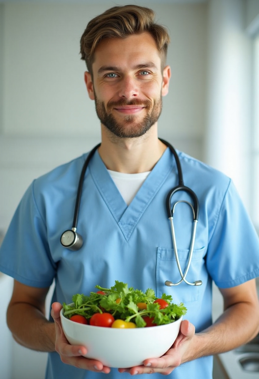 Мужчина-нутрициолог в голубой медицинской форме держит в руках миску с овощным салатом, позади — белый светлый интерьер. Он смотрит в объектив с лёгкой улыбкой. Крупный план.