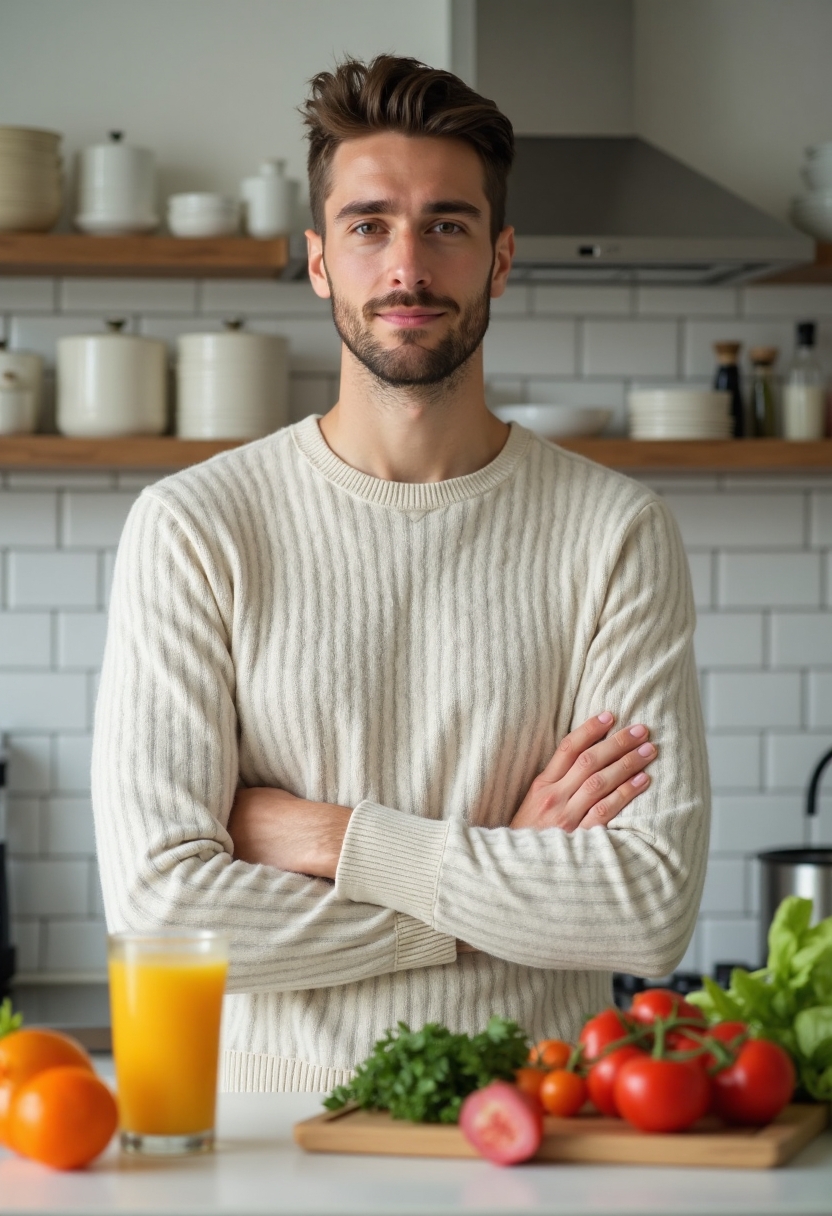 Мужчина-нутрициолог в светлом пуловере стоит у белого кухонного стола с овощами и бутылкой сока, объясняет клиенту преимущества здорового питания. Смотрит в камеру с уверенностью. Крупный план.