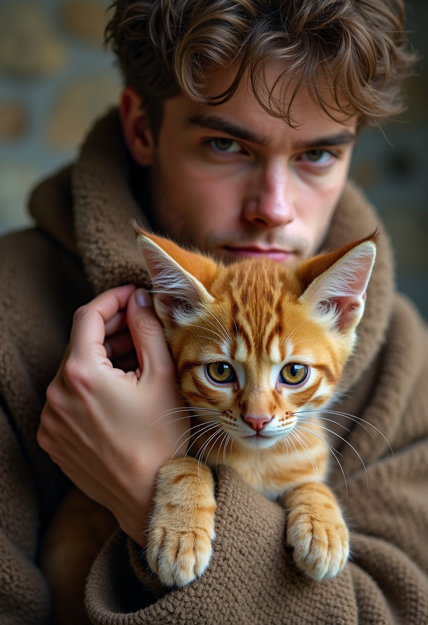 Примерить образ на себеМужчина обнимает рыжего кота. Он смотрит в камеру, слегка касаясь лба животного, а котёнок напряжённо изучает объектив. Позади размытый каменный фон, мягкое тёплое освещение подчёркивает детали меха Крупный план
